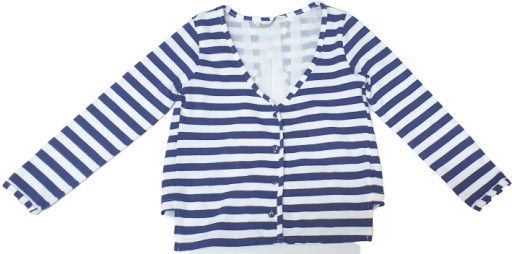 Комплект блуза + накидка застібається на гудзики. Біла блузка з витонченим круглим вирізом і невеликими рукавами. Посередині блузки пришита об'ємна м'яка аплікація у вигляді серця. Накидка темно-синя в смужку на білому фоні, застібається на гудзики, а на спинці вставка зі світлого жоржету (прозорий матеріал).