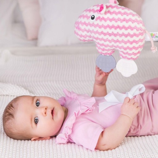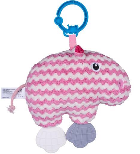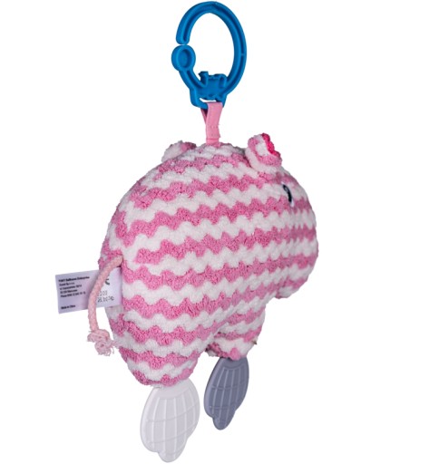 Крім того, в животику хіпі чекають малюка прикріплені прорізувачі і дзвіночок, завдяки якому тварина видає щасливий звук, коли його погойдують. Зручна ручка дозволяє прикріпити іграшку де завгодно, наприклад, у колясці, машині чи інтернет-магазині.
