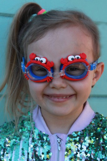 Красиві окуляри для дівчаток і хлопчиків, створені для справжніх любителів водних розваг. Сині окуляри з чарівним акцентом червоного краба.
