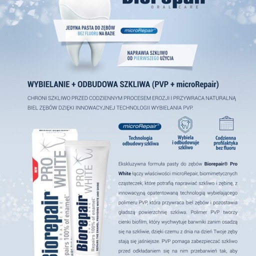 Унікальна формула зубної пасти Biorepair Plus Pro White поєднує в собі дію біоміметичних частинок microRepair, які мають здатність відновлювати емаль, з інноваційною технологією у вигляді запатентованого відбілюючого полімеру PVP. Мікрочастинки ремінералізують емаль, відновлюючи її та захищаючи від процесів ерозії, яким вона піддається щодня, відновлюючи природну білизну та гладку поверхню зуба. Технологія відбілювання PVP також створює тонкий фільтр, який видаляє знебарвлюючі сполуки до того, як вони осідають на поверхні зубів, що робить зуби сяючими з кожним днем. Унікальна формула Biorepair Pro White повертає приємне відчуття свіжості та здорової та природної білизни зубів, додаючи нового блиску посмішці.