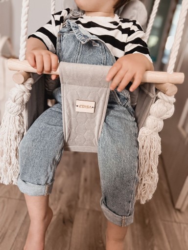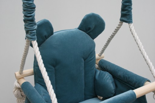 Гойдалки виготовлені з оксамитової тканини, це приємний на дотик плюш з стільниковим стьобанням. Наші гойдалки мають посилене сидіння та спинку. Їх можна легко зняти для прання. У комплекті я отримую подушку/вкладиш, яка має симпатичні вушка та бортики для максимального комфорту під час гри. Гойдалки підвішені на бавовняних мотузках fi 14, 3-жильні, кручені. На кожному кінці є естетична китиця. Довжина мотузки 2,20 м, ідеально підходить для кімнат висотою 2,6 м. Міцна мотузка гарантує безпеку нашої дитини. Поперечини з масиву дерева. На додаток до очевидних цінностей, які поєднуються з задоволенням, гойдалки стануть красивим, декоративним елементом кожної кімнати. Кожна гойдалка має дві оксамитові оболонки для мотузок.