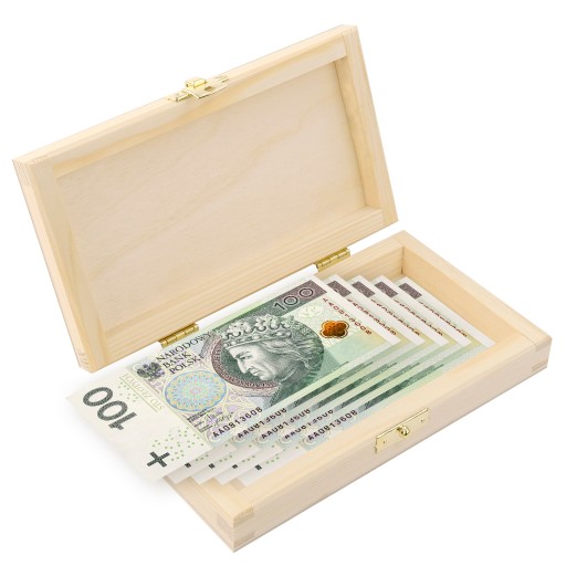 Розмір ящика ідеально відповідає розміру банкнот. Висота 3,5 см дозволить розмістити велику суму готівки, а в довжину і ширину легко поміститься банкнота номіналом 500 злотих.
