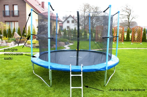 Основним елементом безпеки є внутрішня сітка. Дуже щільний і еластичний, оснащений блискавкою. Крім того, він закріплений зовні за допомогою пряжки, що значно підвищує безпеку. Кришка пружини виготовлена з дуже товстого і гнучкого ПВХ, наповненого 2 см піною, що істотно впливає на її довговічність. Характеристика. Конструкція виготовлена з оцинкованої сталі. Він стійкий до корозії та погодних умов.
