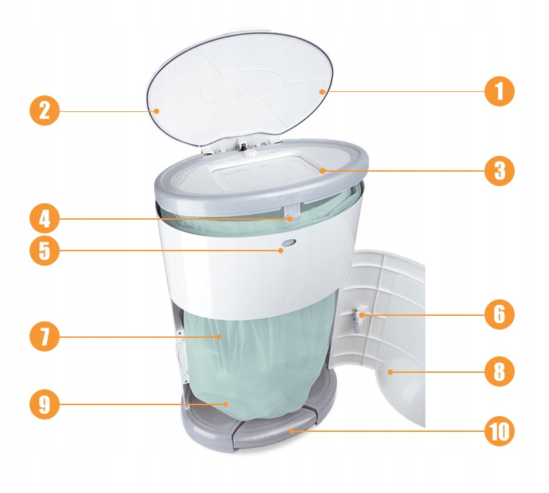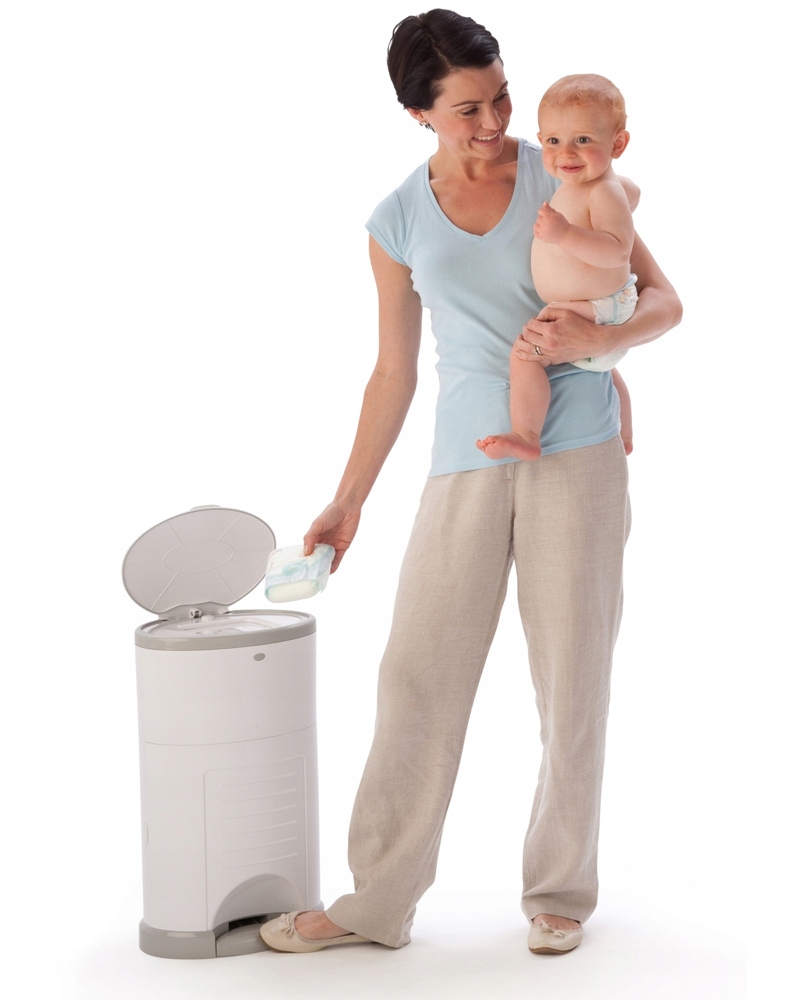 Pojemnik wyposażony jest w specjalny pedał, który umożliwia otwieranie pokrywy i wyrzucenie pieluszki całkowicie bez użycia rąk.