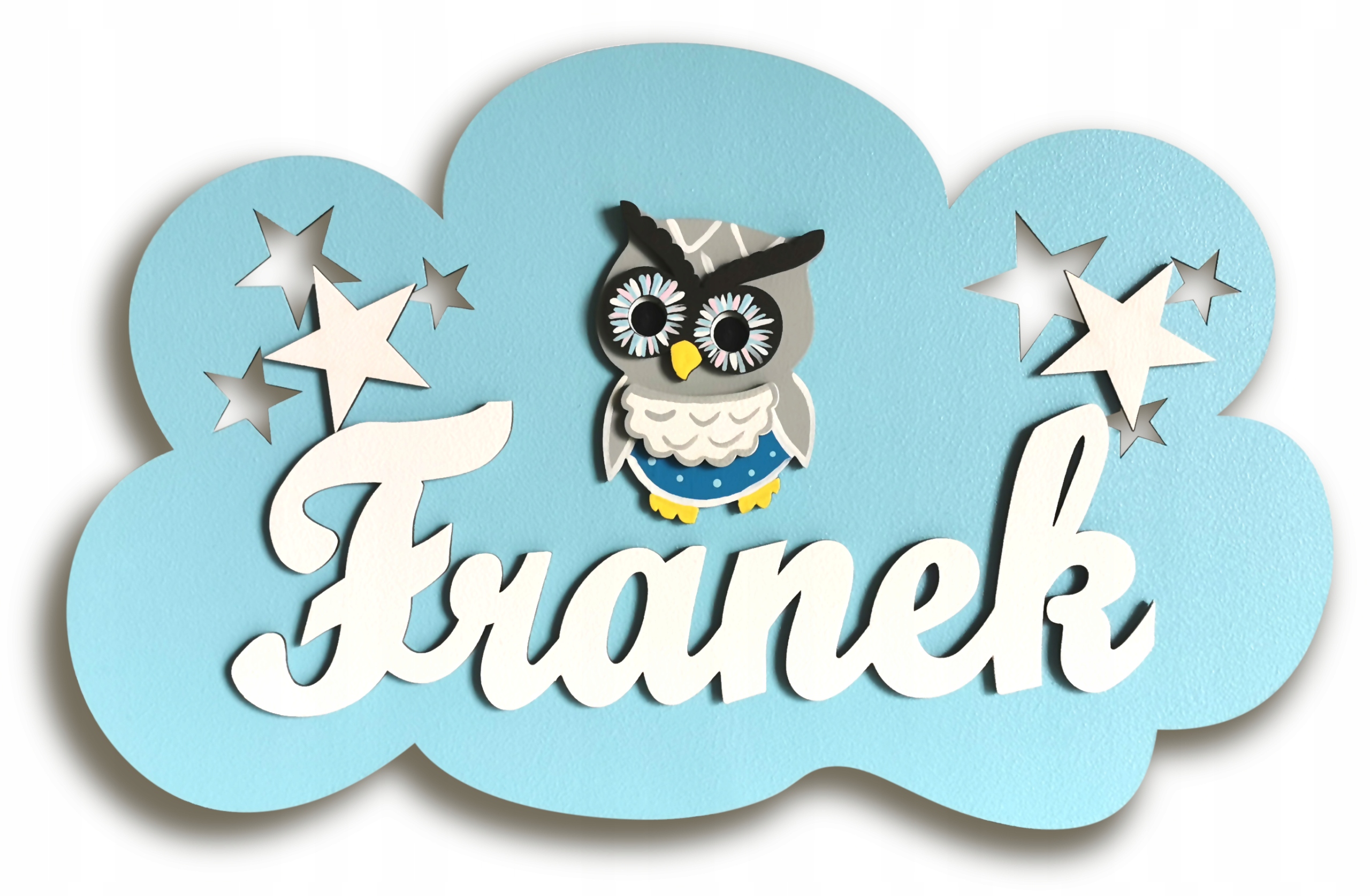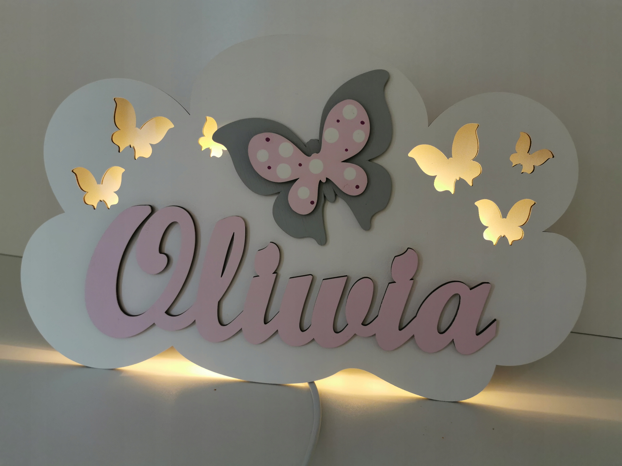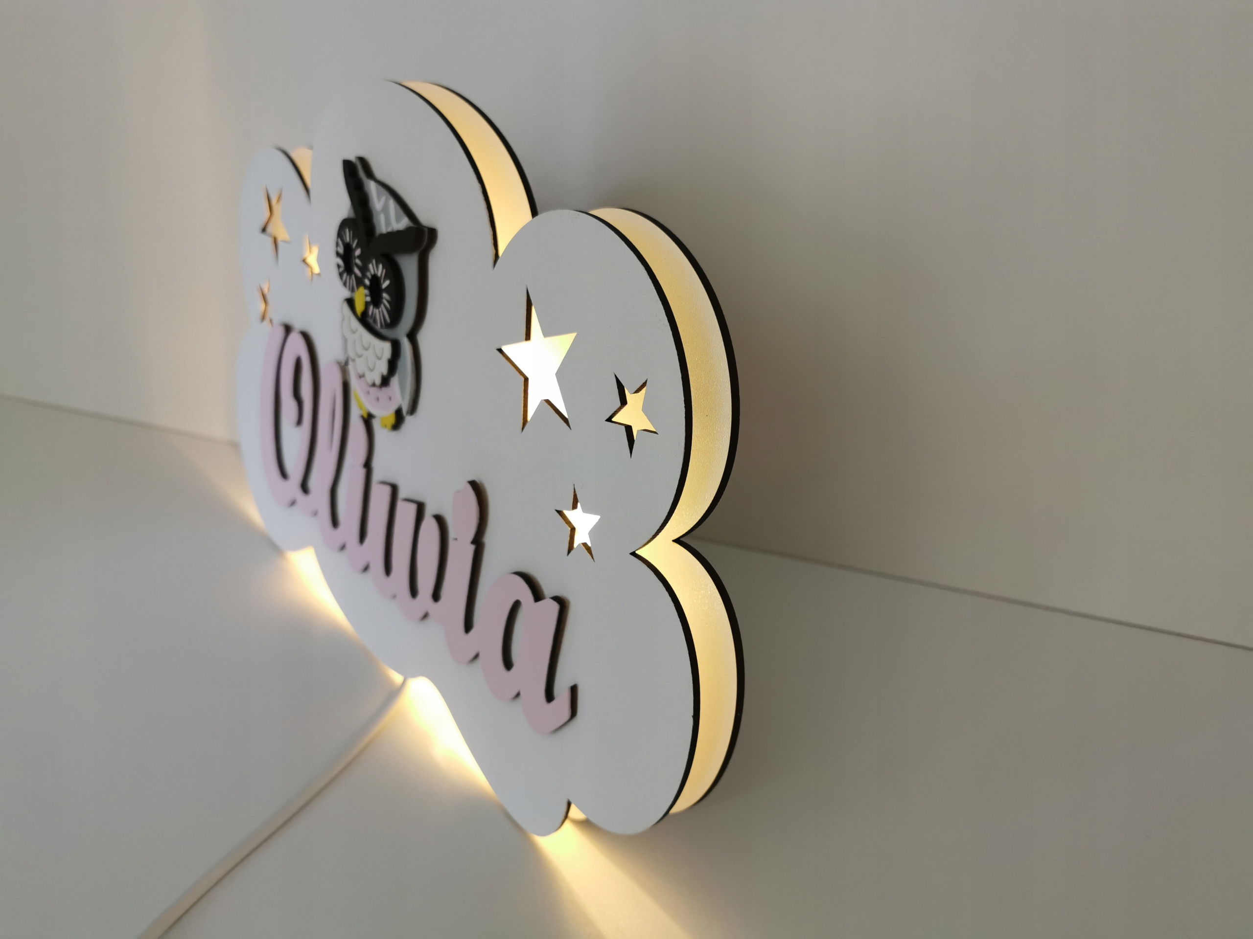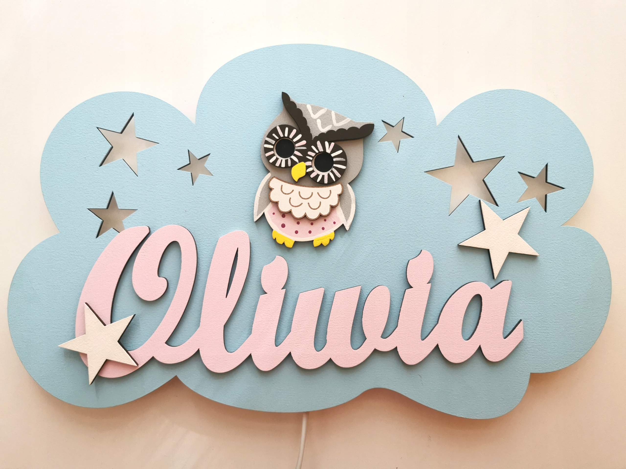 Lampka posiada wycięte elementy ażurowe w postaci gwiazdek oraz motyli. Dodatkowo na każdej chmurze umieszczamy napis z imieniem twojego dziecka i jeden dekor 10 cm do wyboru: motyl, sowa, miś.
