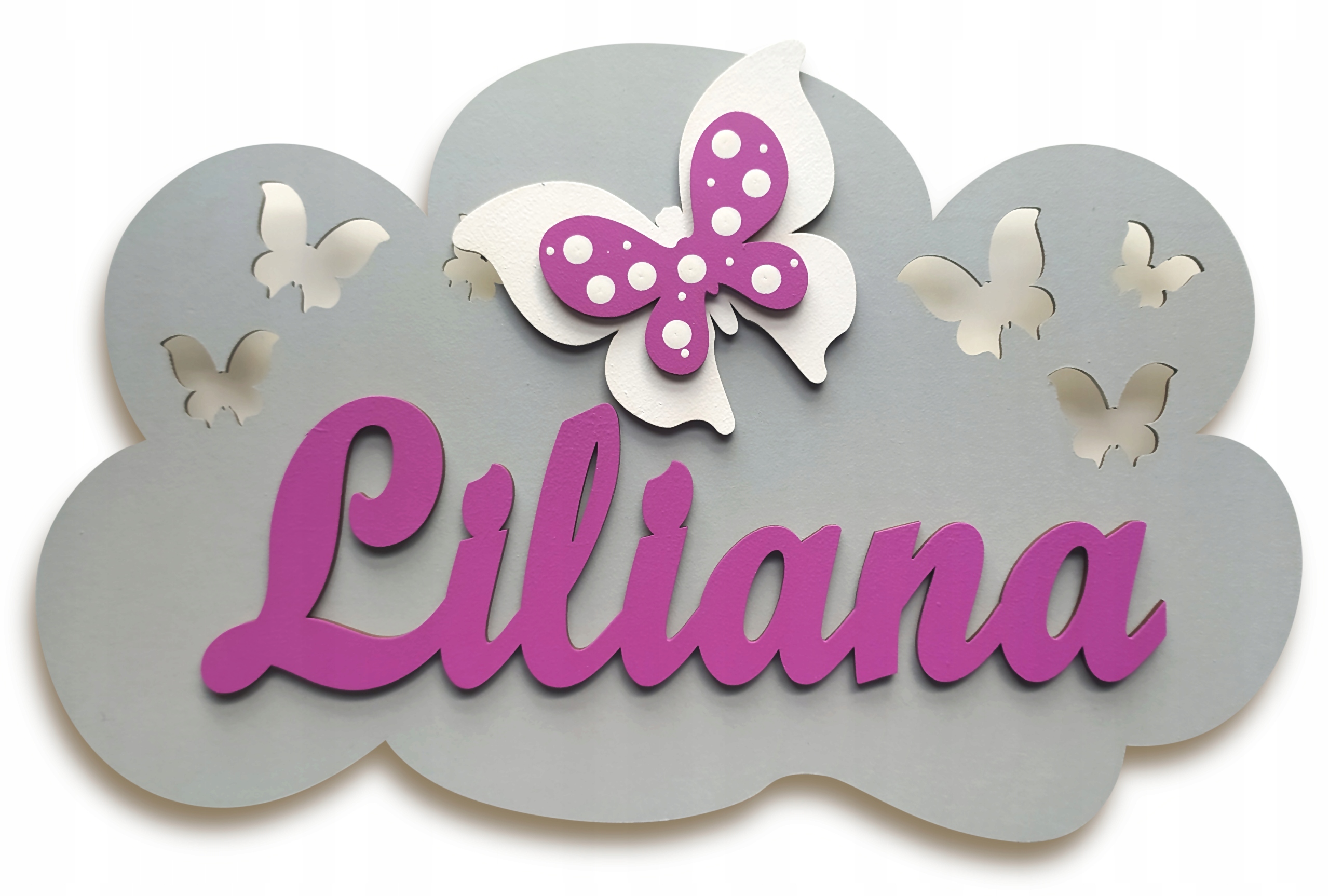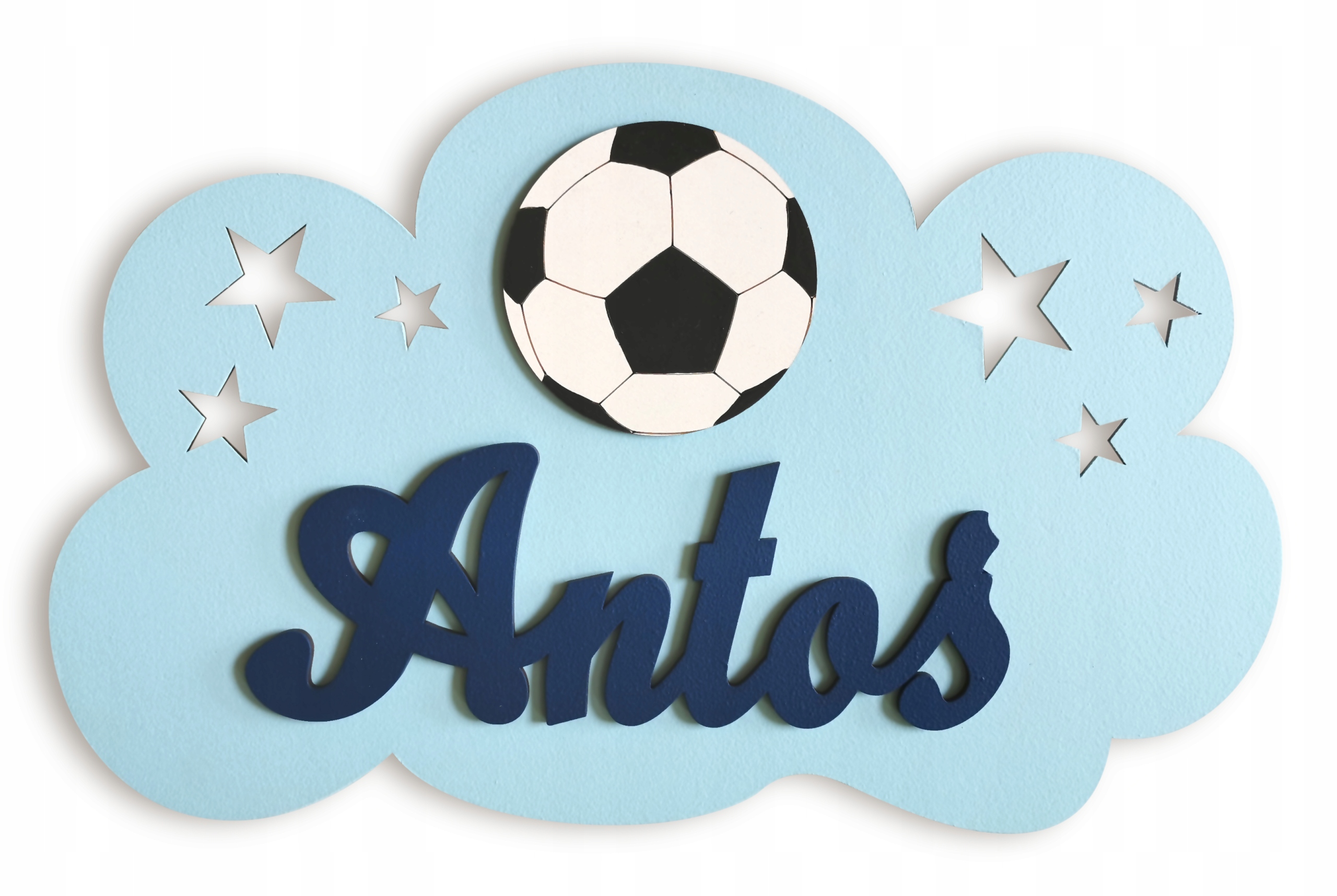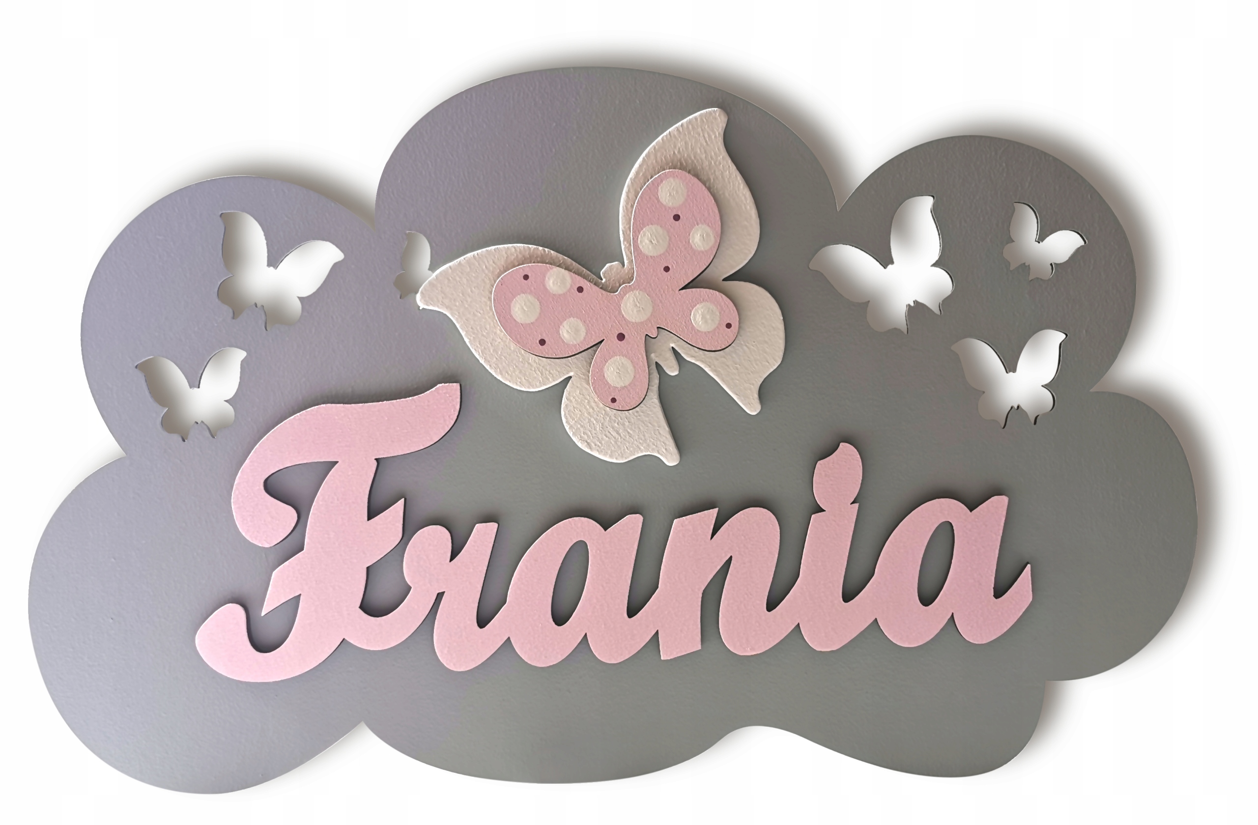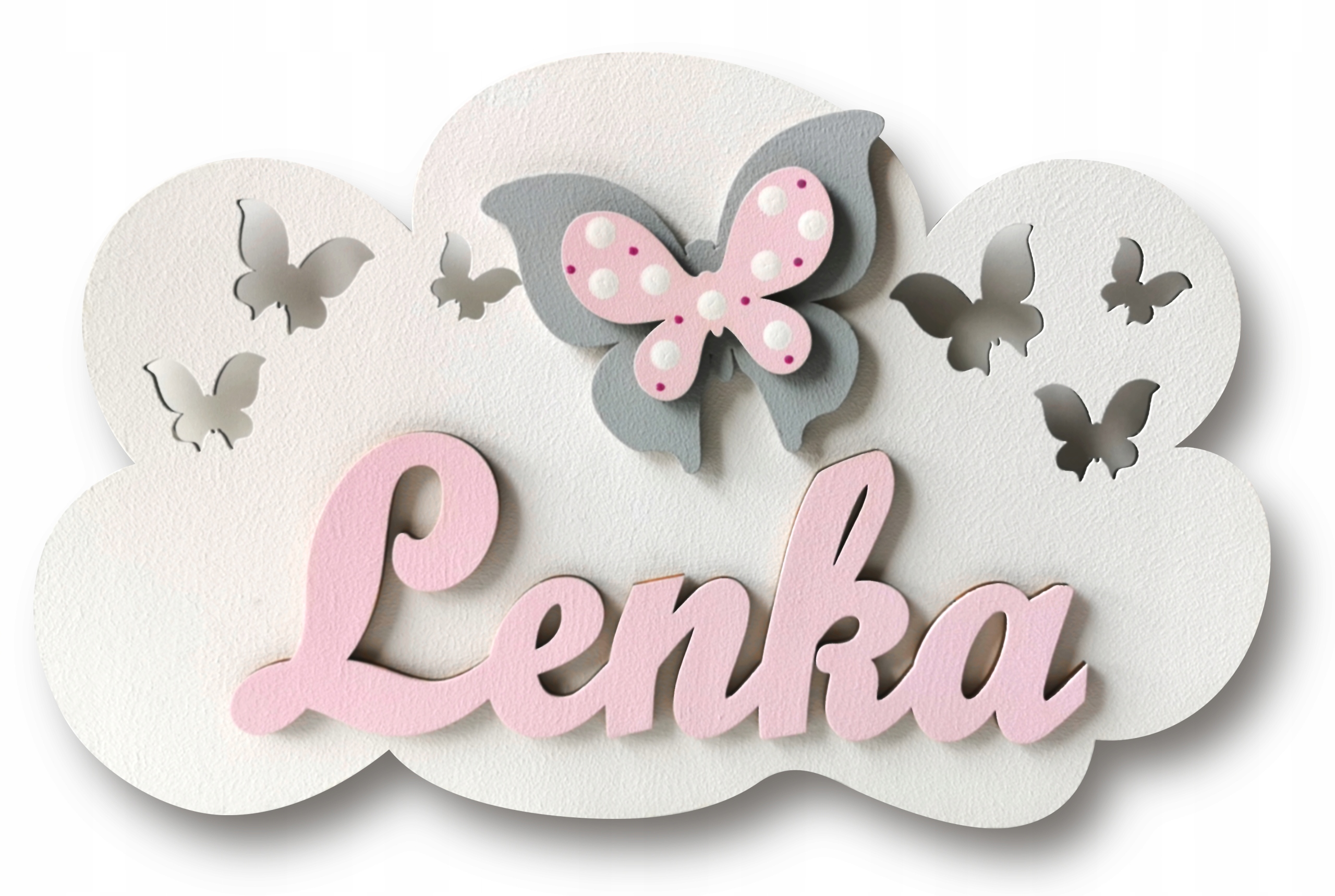 Lampka posiada wycięte elementy ażurowe w postaci gwiazdek oraz motyli. Dodatkowo na każdej chmurze umieszczamy napis z imieniem twojego dziecka i jeden dekor 10 cm do wyboru: motyl, sowa, miś.