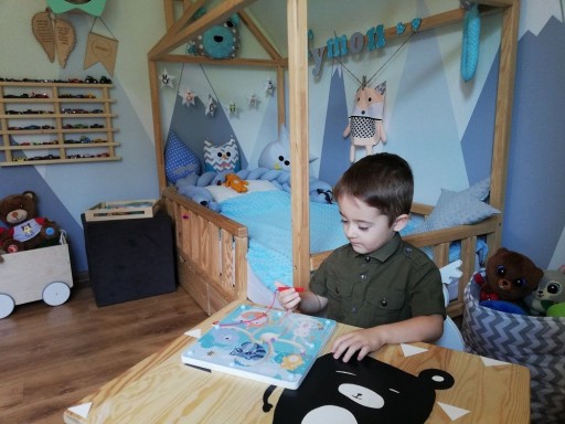 Магнітний лабіринт являє собою дерев'яну дошку з принтом милих лісових тварин, на яку нанесено прозоре пластикове скло. З’єднані разом, вони не дозволяють кулькам висипатися. Магнітна паличка, прикріплена до основи і з’єднана з нею за допомогою шнурка, теж має своє місце.