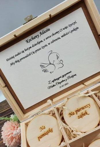 Коробка складається з 6 відділень, в яких поміщено 6 кружечків з вигравіруваними написами, в яких міститься ім'я дитини, а також ім'я дарувальника. Ви також можете вибрати з великої кількості побажань. Ви можете завантажити свій власний.