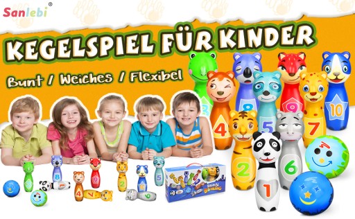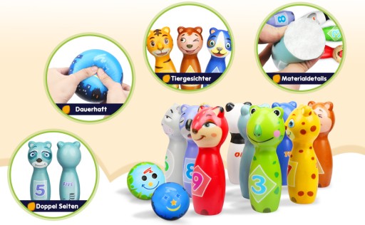 - Набір для боулінгу для дітей - 10 конусів і 2 кулі, різні кольори, морда тварини, цифри.