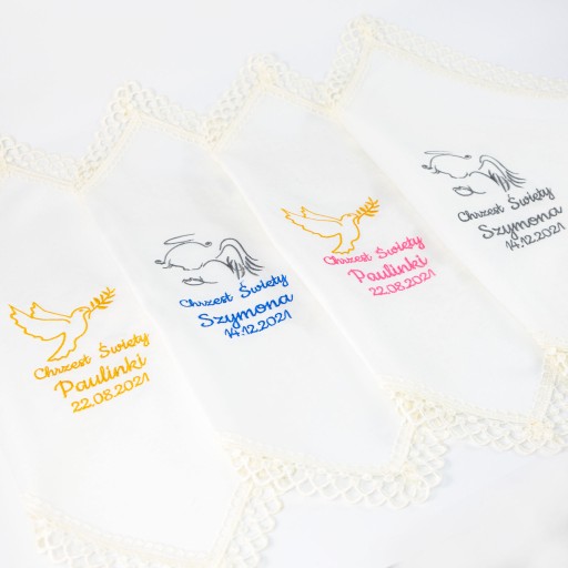 - халат розміром 35х35 см прикрашений мереживом з вишитим ім'ям дитини