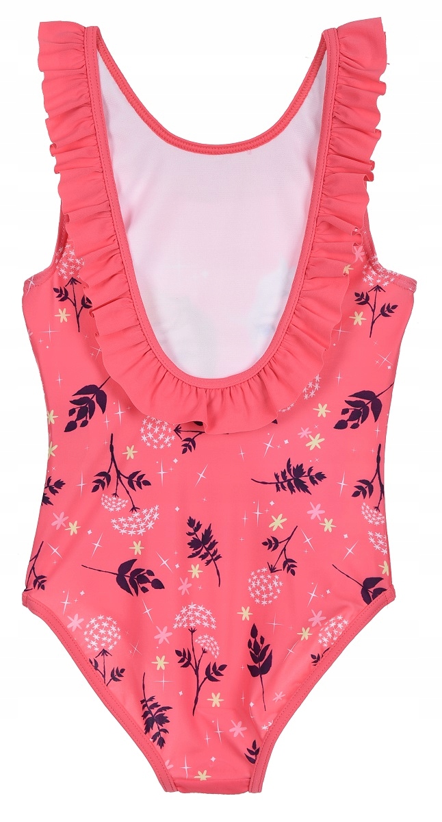 Jednoczęściowy kostium kąpielowy o bardzo ładnym fasonie, w żywej kolorystyce z dużym miękki nadrukiem z postaciami z ulubionych bajek. Fantazyjnie wykończony. Kostium wykonany z dobrych jakościowo materiałów, naddaje się i naciąga dzięki czemu jest komfortowy w noszeniu.
