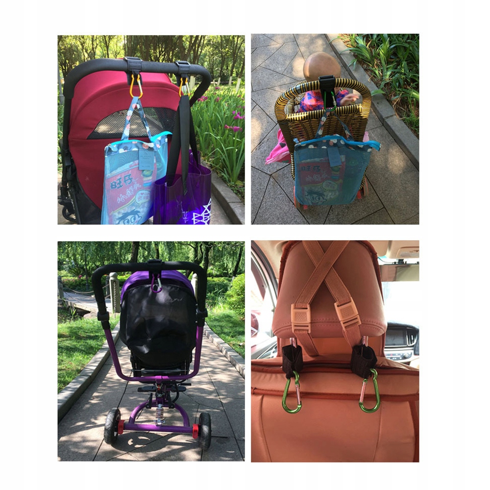 Uchwyty do wózka są przydatnym elementem, aby zaczepić torebkę czy torby z lekkimi zakupami na rączce wózka. Dzięki zapięciu na rzep, haczyki pasują do każdego modelu wózka.
