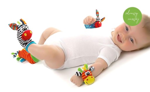 Веселі пов'язки стимулюють зір своїми контрастними кольорами. Пов'язки та носочки видають цікаві звуки при струшуванні, заохочуючи малюка рухати руками.