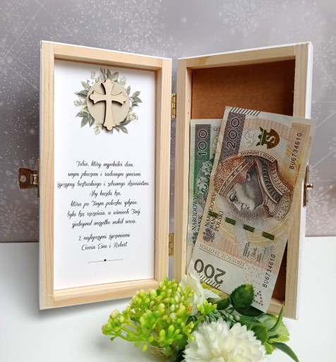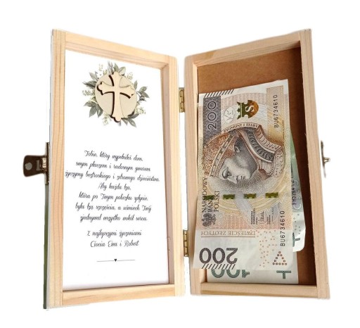 Дерев'яна коробка з персональними побажаннями та місцем для готівки чи іншого подарунка.