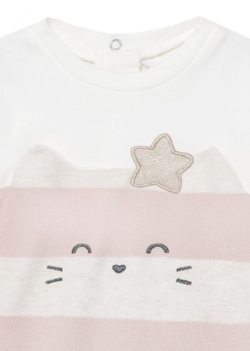 Піама з довгим рукавом для новонароджених дівчаток від 0 до 18 місяців. пісні з ногами. Круглий виріз. Ззаду застібається маленькими кнопками, що полегшує одягання. Застібається на застібки в промежині. Смугастий мотив.