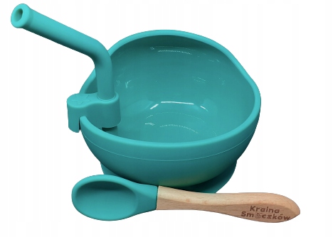 Wzór: Turkusowa miska z łyżeczką i słomką.