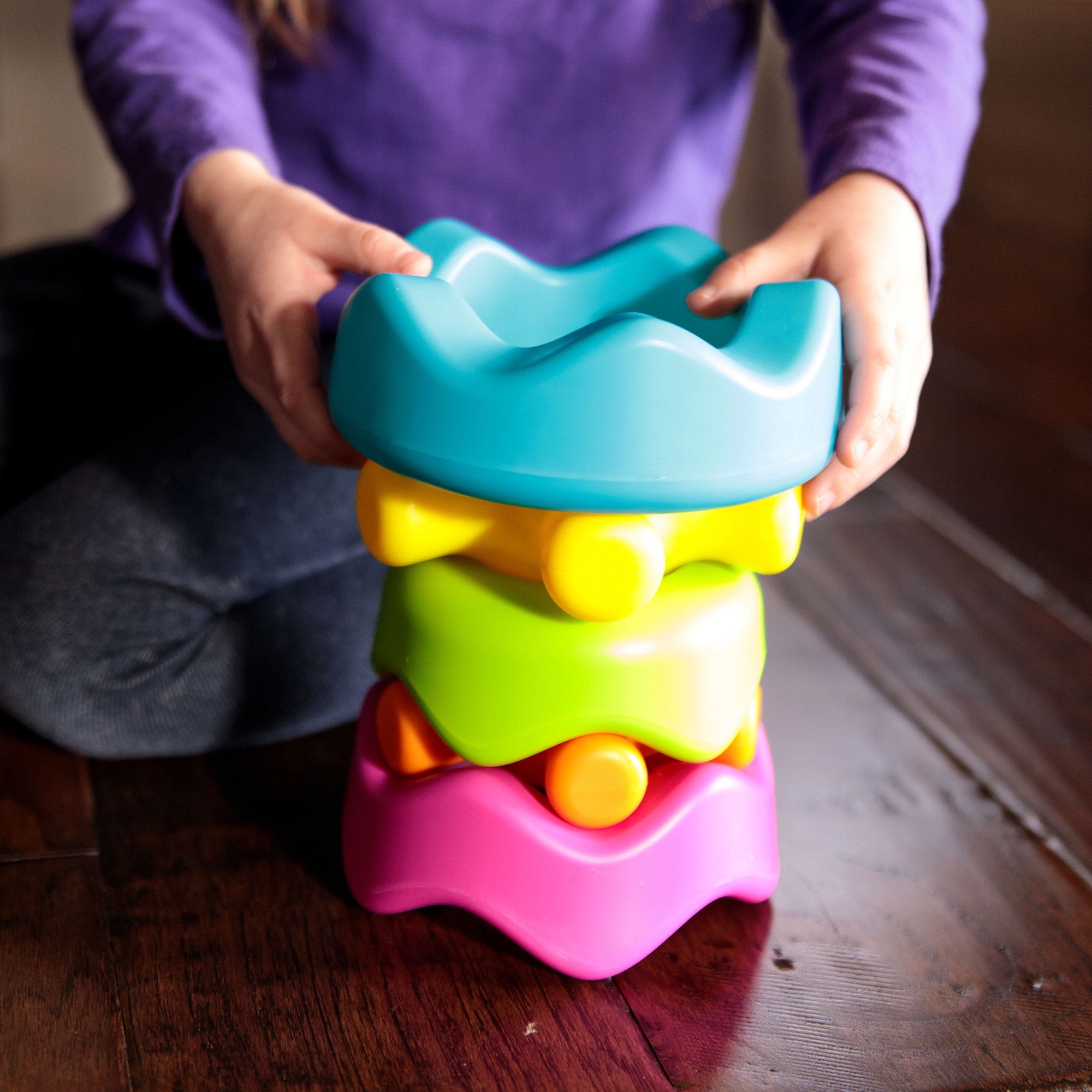 Dwie gwiazdki i trzy kolorowe, faliste pierścienie niecierpliwie czekają, aż najmłodsi wyjmą je z wiaderka i wrzucą do kąpieli, lub będą układać w piramidkę. Pierścienie można układać na sobie, lub gwiazdki na pierścienie, w kubełku i poza nim, w kąpieli i poza nią, lub wymyśl własną konfigurację – nie ma złego sposobu na zabawę! Kubełek ma dziurki w podstawie, w wannie woda będzie z niego tryskać jak deszcz, a poza nią masz pewność, że nie będzie wody na dywanie.