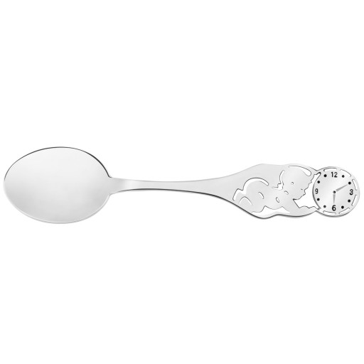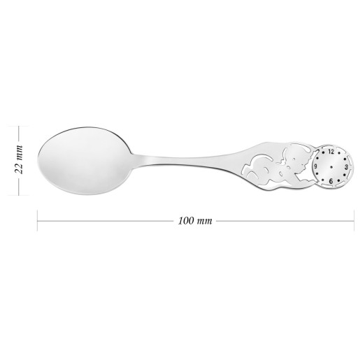 чайна ложкавін виготовлений зі срібла, що гарантує його довговічність. На ручці вигадливо виконана фігурка маленького немовляти і циферблат годинника.
