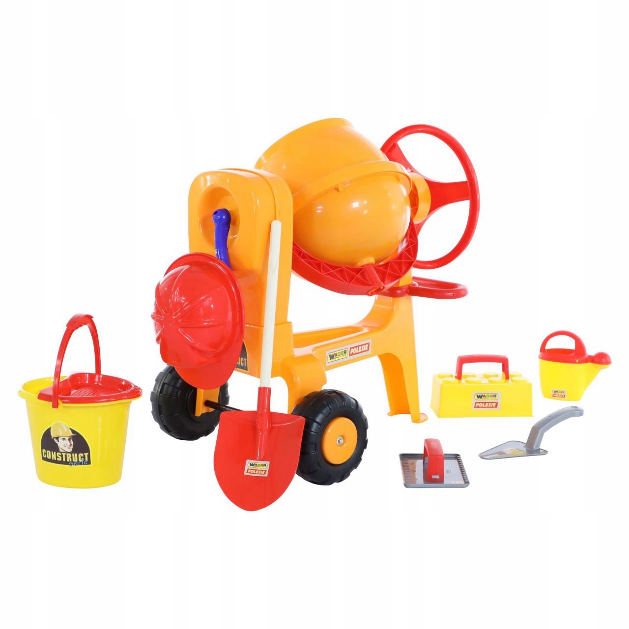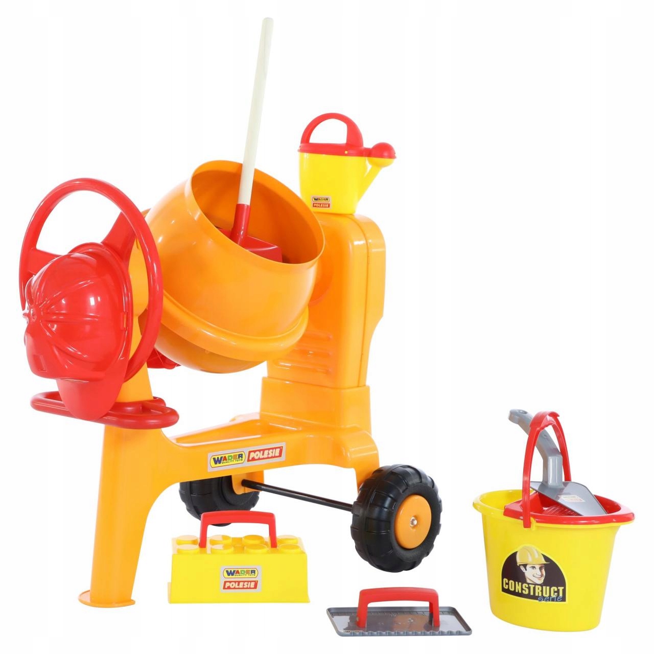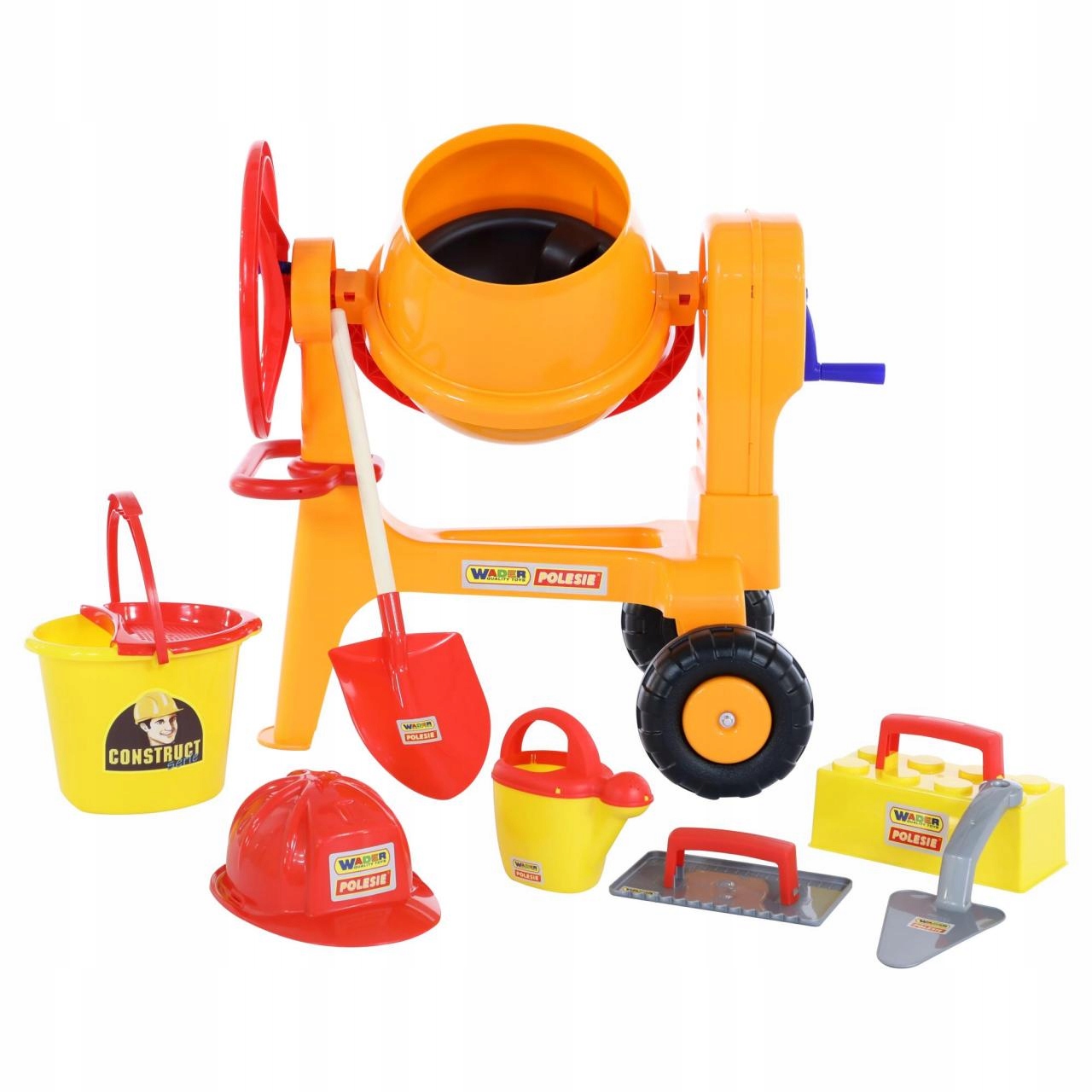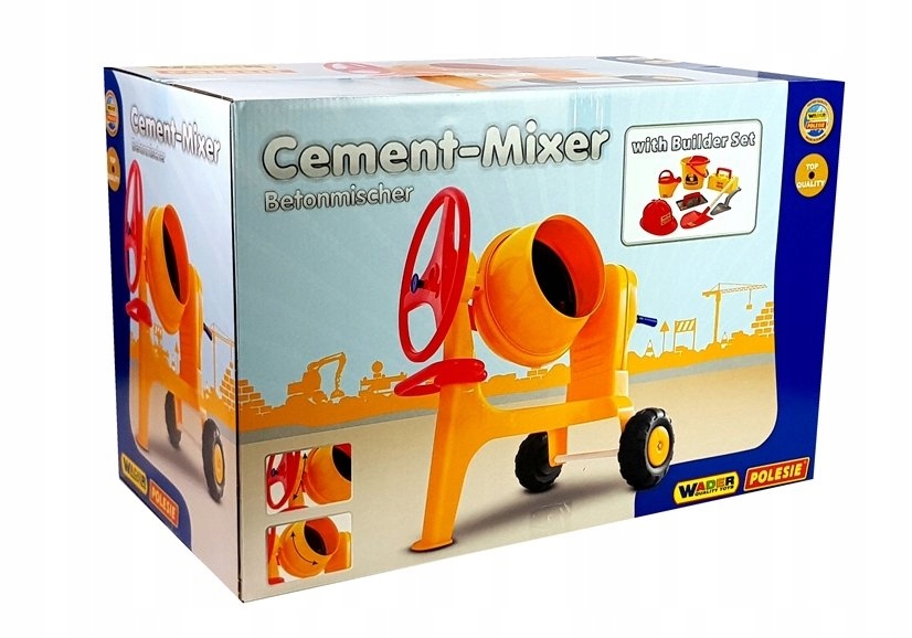 Bestseller wśród zabawek wykorzystywanych przez małych budowniczych to BETONIARKA NR 1 od firmy POLESIE WADER Quality Toys. Jest duża (jej wysokość to 67 cm), posiada duży bęben i można w mieszać przeróżne składniki w sporych ilościach. Kręcenie korbą sprawia, że bęben się obraca a wraz z nim wszystko co w środku umieszczono. Dzięki specjalnemu uchwytowi bęben betoniarki można przechylać, co umożliwi jej łatwe opróżnienie. Zabawka posiada dwa szerokie koła. Pozwala to na jej sprawne transportowanie. Produkt wykonany jest z wysokiej jakości plastiku. Możemy być więc pewni jego trwałości i bezpieczeństwa podczas użytkowania. Dodatkowo w zestawie komplet akcesoriów: kask, łopatka, wiaderko, konewka, szpachla.