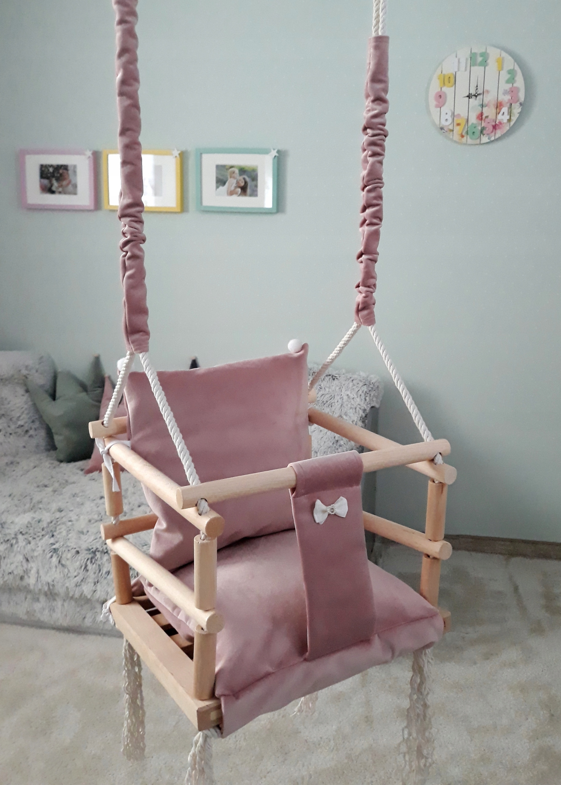 Huśtawka wykonana z delikatnego aksamitno pluszowego materiału, który jest bardzo miękki i delikatny w dotyku oraz bardzo wytrzymały.