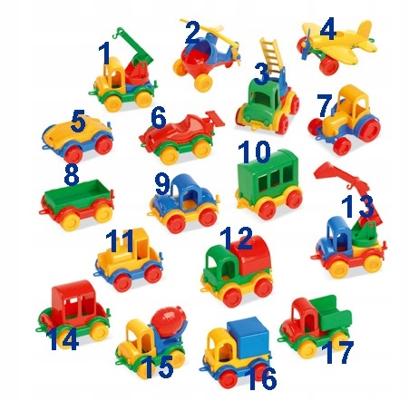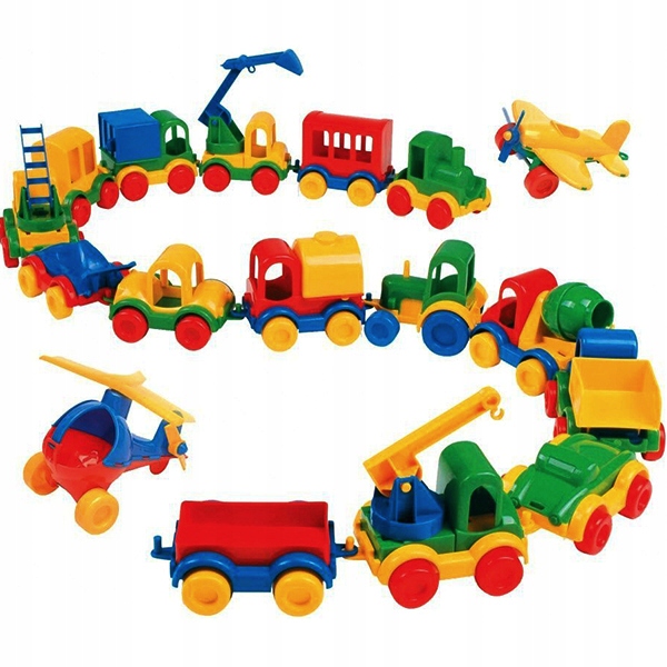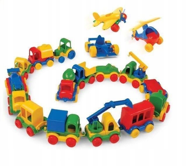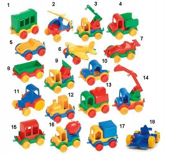18 modeli - traktor, cysterna, autko, dwa rodzaje wyścigówek, straż pożarna, wagony z wieloma oknami, kontener, koparka, lokomotywa, przyczepka, dźwig, wywrotka, betoniarka, samolot, helikopter i formuła 1.