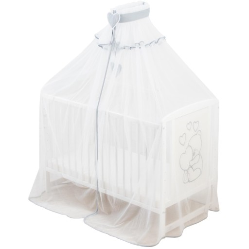 Легка і повітряна москітна сітка на ліжко білого кольору з сірими аксесуарами у формі серця.