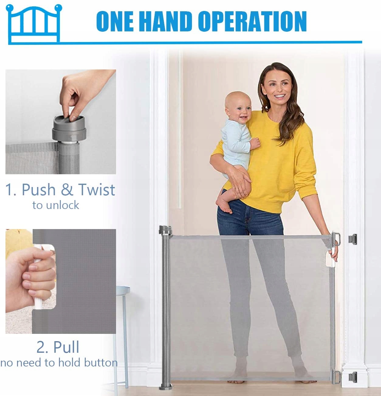 Dzięki wysuwanej konstrukcji z łatwością dostosujesz osłonę do swoich potrzeb. Ogrodzenie może służyć jako bariera bezpieczeństwa przy drzwiach, schodach i w korytarzach.