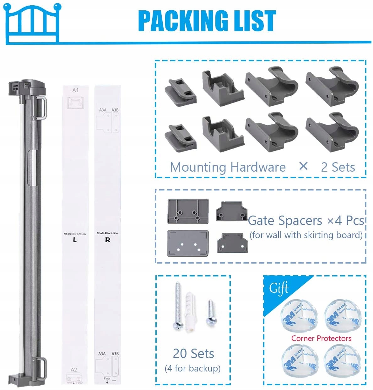 Bramkę można rozwinąć za pomocą jednej ręki. W zestawie z bramką znajdują się elementy do montażu, który jest bardzo prosty.