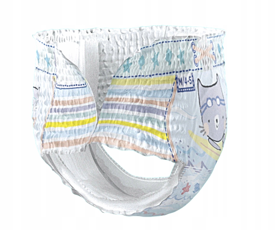 - Elastyczna taśma wokół talii zapewnia dopasowanie 360°, dzięki czemu pieluszka przylega niczym strój kąpielowy