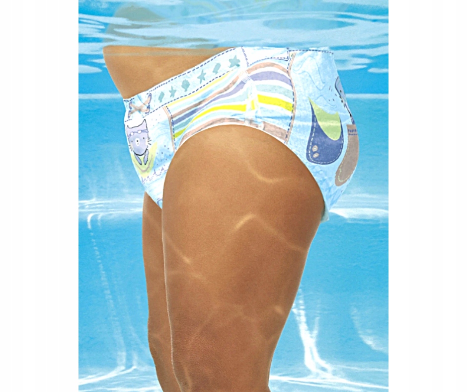 - Zainspirowana pływaniem grafika sprawia, że pieluszka wygląda jak strój kąpielowy