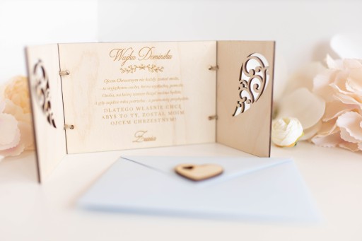 Дерев'яна книжечка з красивим вирізаним ажурним візерунком була перев'язана декоративною джутовою ниткою. На обкладинці велике сердечко або крильця з написом "Дорога тітка" Дорогий дядечко Всередині віршик і питання до кумів :)
