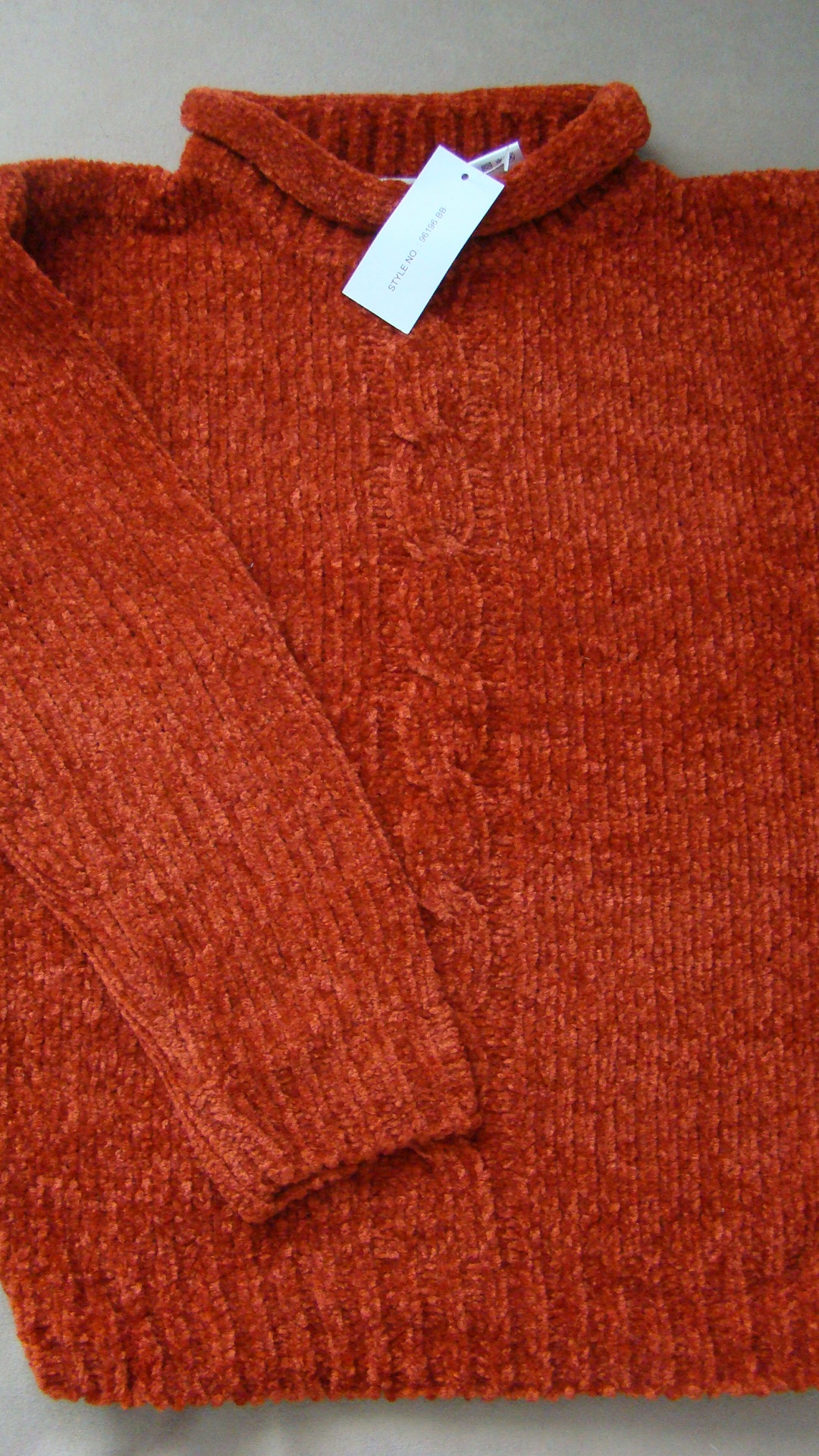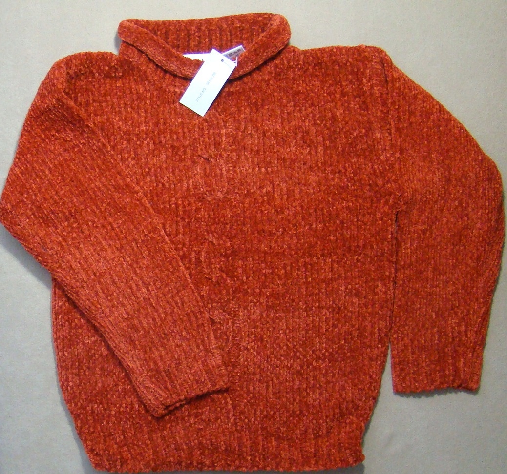 Rozmiar 98/104 na długi rękaw, koloru miedzianego/pomarańczowego, wkładany przez głowę (patrz zdjęcie). Mini golfik dla dziewczynki.