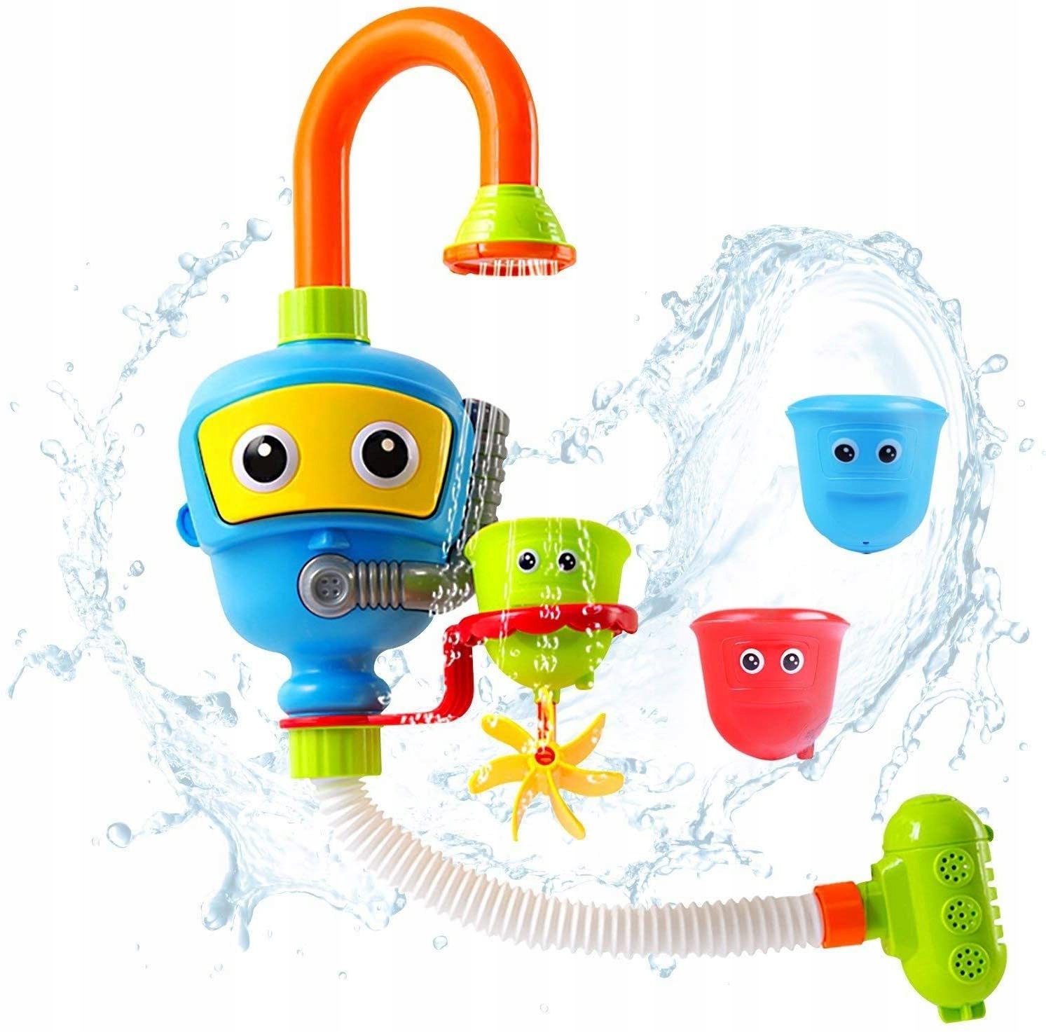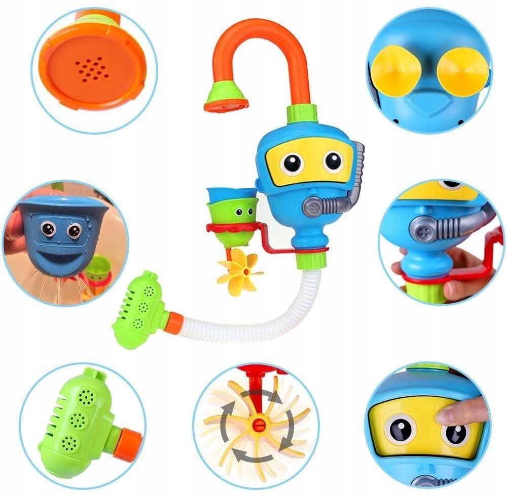 Zabawka idealna do wanny dla niemowląt, swoimi funkcjami zachęci malucha do samodzielnej zabawy i poznać mechanizmy nalewania wody z kubeczków. Z tyłu robot ma zamontowane przyssawki, dzięki którym możemy przymocować do wanny. Spód zabawki powinien znajdować się w wodzie. Po zamocowaniu zabawki wystarczy nacisnąć okulary nurka, a woda zacznie spływać z prysznica do fontanny. Za pomoc specjalnych kubków można łatwo zmienić kierunek przepływu wody. A woda z łatwością obraca młyn, tworząc wodospad wody.