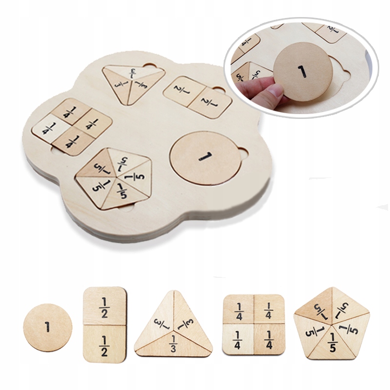 W podstawie (z drugiej strony) znajdują się figury, które pomagają dziecku w nauce i zrozumieniu ułamków w zakresie od 1, 1/2 aż 5/5