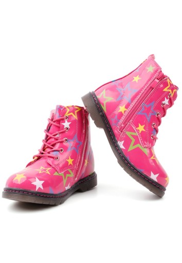 Чоботи Trapper - чоботи для дівчинки на підошві Trapper з невеликим каблуком. Виготовлений з екологічної лакованої шкіри. Верх, що прикриває щиколотку, прикрашений красивими зірочками по всій поверхні. Спереду зав'язується шнурками, зсередини додатково застібається на блискавку. Ззаду декоративна стрічка з вшитою петелькою. Злегка утеплені. Вони додадуть стилю та оживлять кожну укладку цього сезону!