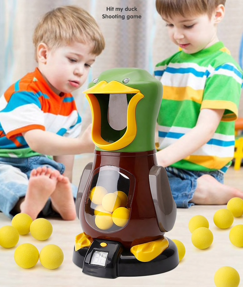 Kiedy pocisk uderzy w język kaczki, zabawka odtwarza charakterystyczny dźwięk.
