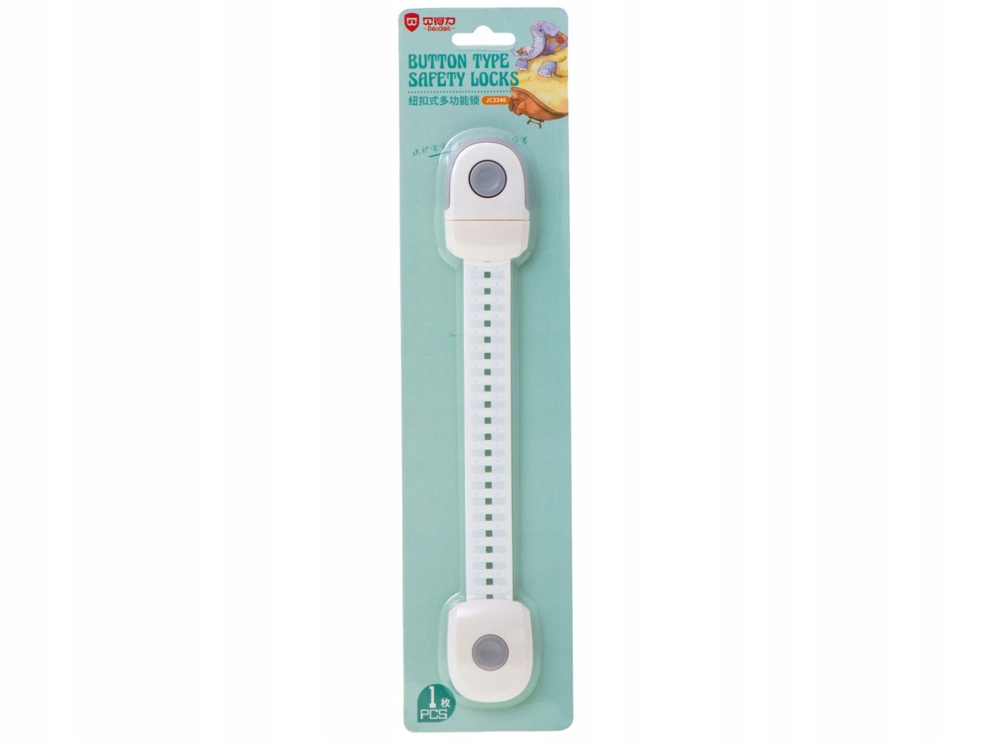 Zabezpieczenie otwierane przy pomocy przyciskuna jednym końcu.
