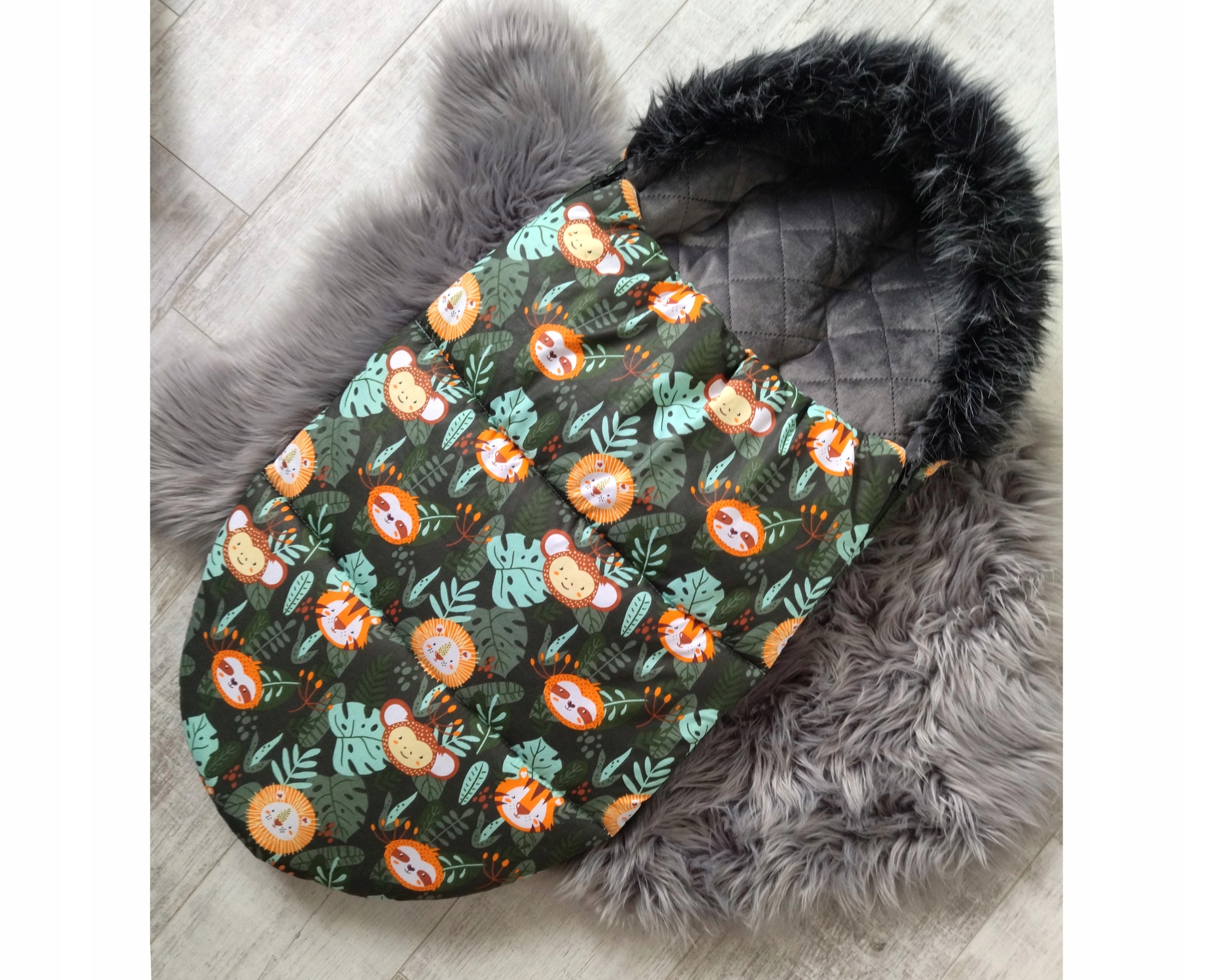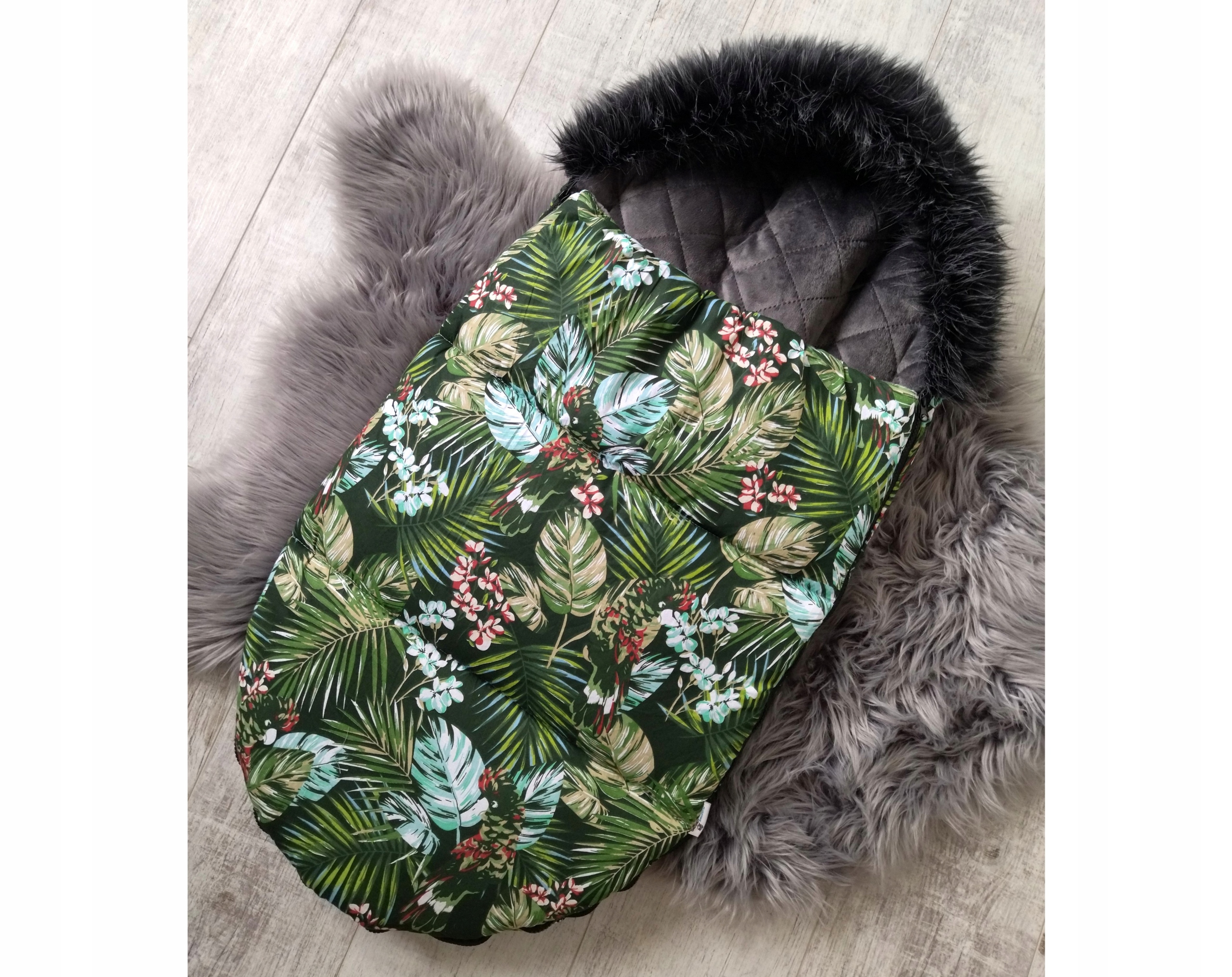 Śpiworek jest niezwykle oryginalny, praktyczny i ciepły. Możesz dopasować kolorystycznie do swojego wózka lub wybrać odróżniający się i przyciągający oko wzór. Kaptur jest ozdobiony sztucznym futerkiem w ciemnym lub jasnym kolorze. Po bokach 2 zamki, które można odpiąć całkiem i zdjąć górną część śpiworka np. wchodząc zimą do sklepu - nie trzeba budzić i wyjmować dziecka z wózka (funkcja wkładki). Zamki do wyboru w 2 kolorach (biały i czarny). W środku śpiworek wykonany z ciepłej tkaniny velvet (gładkie minky) pikowanej w romby w kolorze grafitowym.