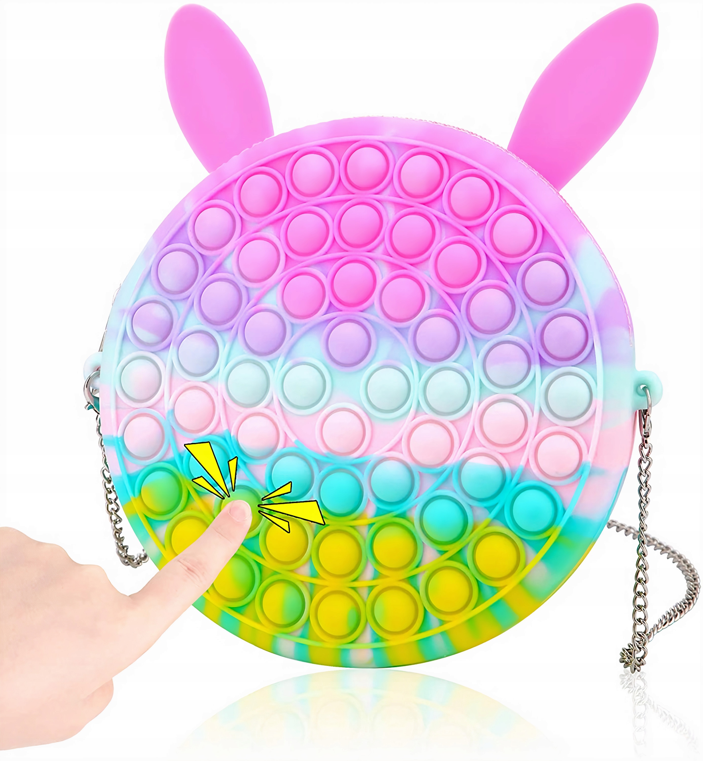 Projekt inspirowany jest Fidget Toys Pop It, popularną zabawką na stres. Połączenie torebki i pop it w jednym to idealny pomysł na prezent dla każdego dziecka.