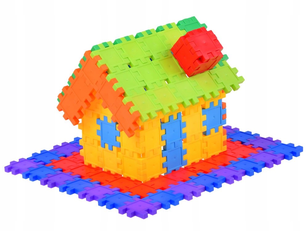 Zabawa klockami może być wielowymiarowa, ponieważ dziecko może budować budowle przestrzenne, domki, mosty, kwiaty, zwierzątka. W skład zestawu wchodzi także kolorowa książeczka z pomysłami do tworzenia budowli.