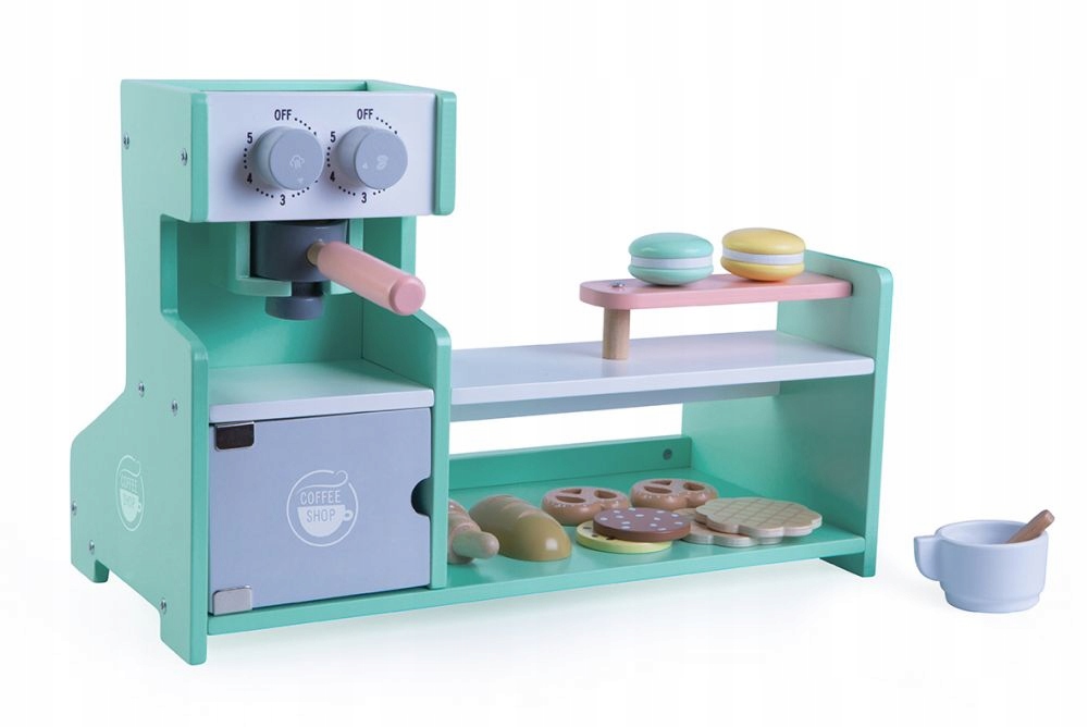 Kolorowe makaroniki, ciastka, precle czy pieczywo to artykuły, którymi można bawić się do woli. W zabawkowym ekspresie można przygotować kawę wprost do drewnianej filiżanki. Ruchome pokrętła wydające dźwięk z pewnością zainteresują malucha.