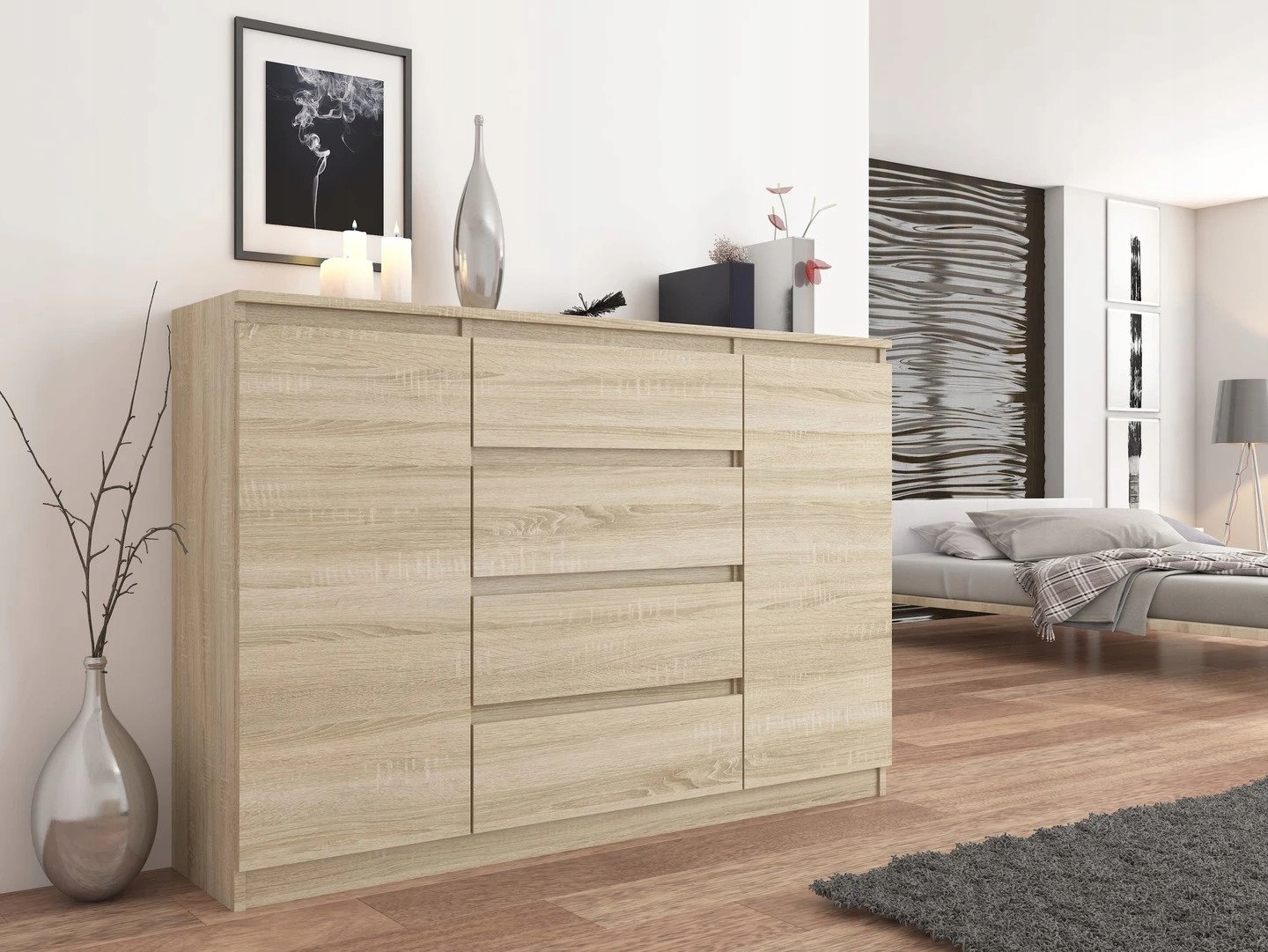 Stylowa komoda z kolekcji MODERN, stworzona dla ludzi, którzy cenią sobie nowoczesny styl i elegancję. Odnowi wnętrze każdej sypialni i salonu. Konstrukcja jest minimalistyczna ale solidna i trwała. Dzięki bez uchwytowym frontom szuflad komoda jest wygodna w użytkowaniu. Ergonomiczne wymiary komody zapewniają swobodę w umeblowaniu pomieszczenia.