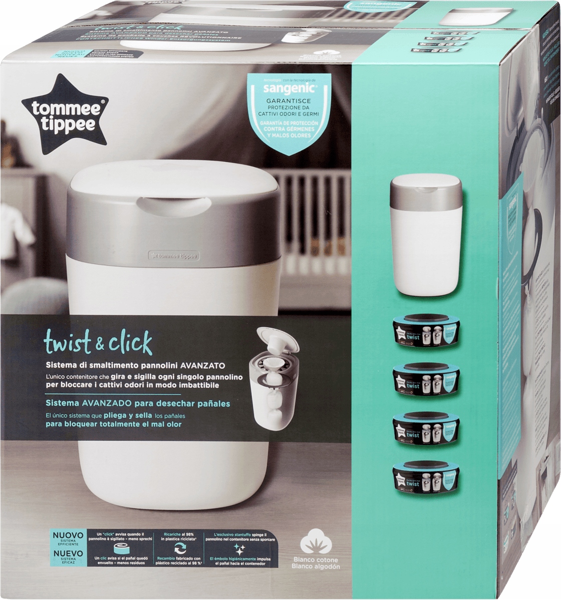 Kosz Sangenic Twist&Click to jedyny pojemnik, który skręca i owija, zapewniając niezrównaną ochronę przed nieprzyjemnym zapachem Pieluszki są pakowane pojedynczo, dzięki czemu zapach i bałagan nie mogą uciec nawet po otwarciu pokrywy lub opróżnieniu pojemnika.