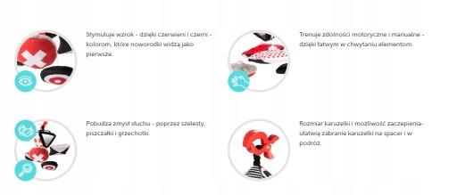 Має дзвіночок, шелестять елементи і брязкальце. Додатковою принадою є два дзеркала - кожна дитина любить дивитися навколо і спостерігати за світом. Карусель стане ідеальним супутником для прогулянок і подорожей, завдяки зручному гачку, який дозволяє кріпити її до автокрісла, коляски, дитячої коляски або як додатковий елемент до сенсорного килимка Canpol babies.