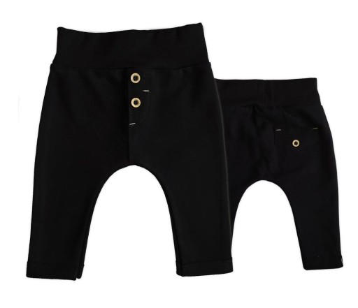 Штани на резинці, без манжетів на штанинах. На місці льотка і на задній кишені пришиті декоративні гудзики.