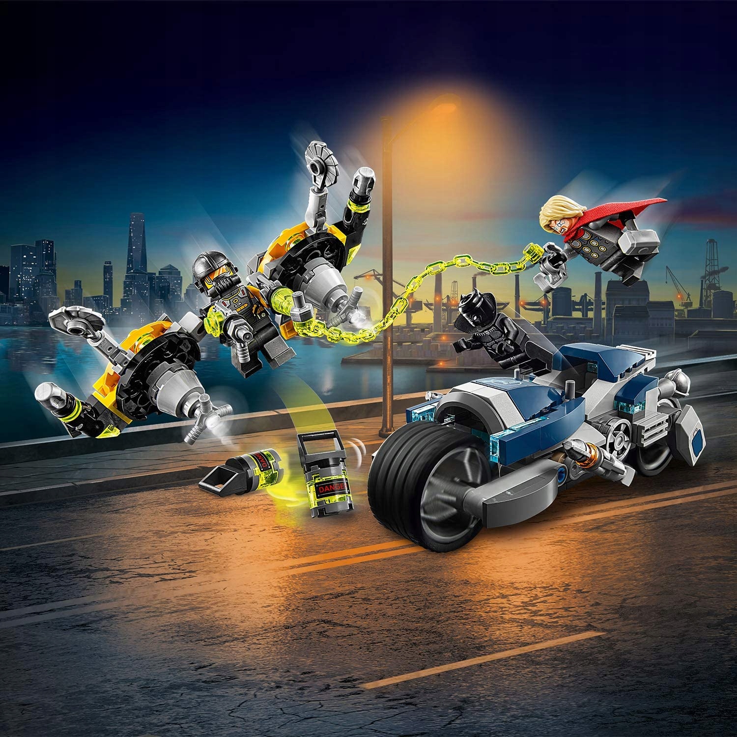 - Trzy nowe minifigurki — Czarna Pantera, Thor i agent AIM — imponujący motocykl Czarnej Pantery, szereg broni oraz dwa kanistry śmiercionośnej substancji — wszystko, czego potrzeba do niezapomnianych przygód!