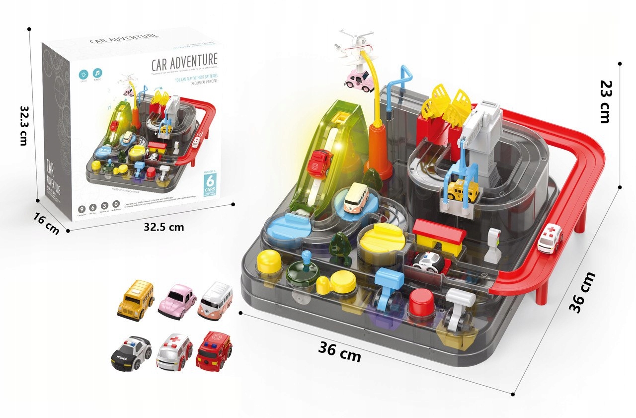 Wielofunkcyjny tor samochodowy będzie nie lada gratką dla żądnych przygód małych odkrywców.
