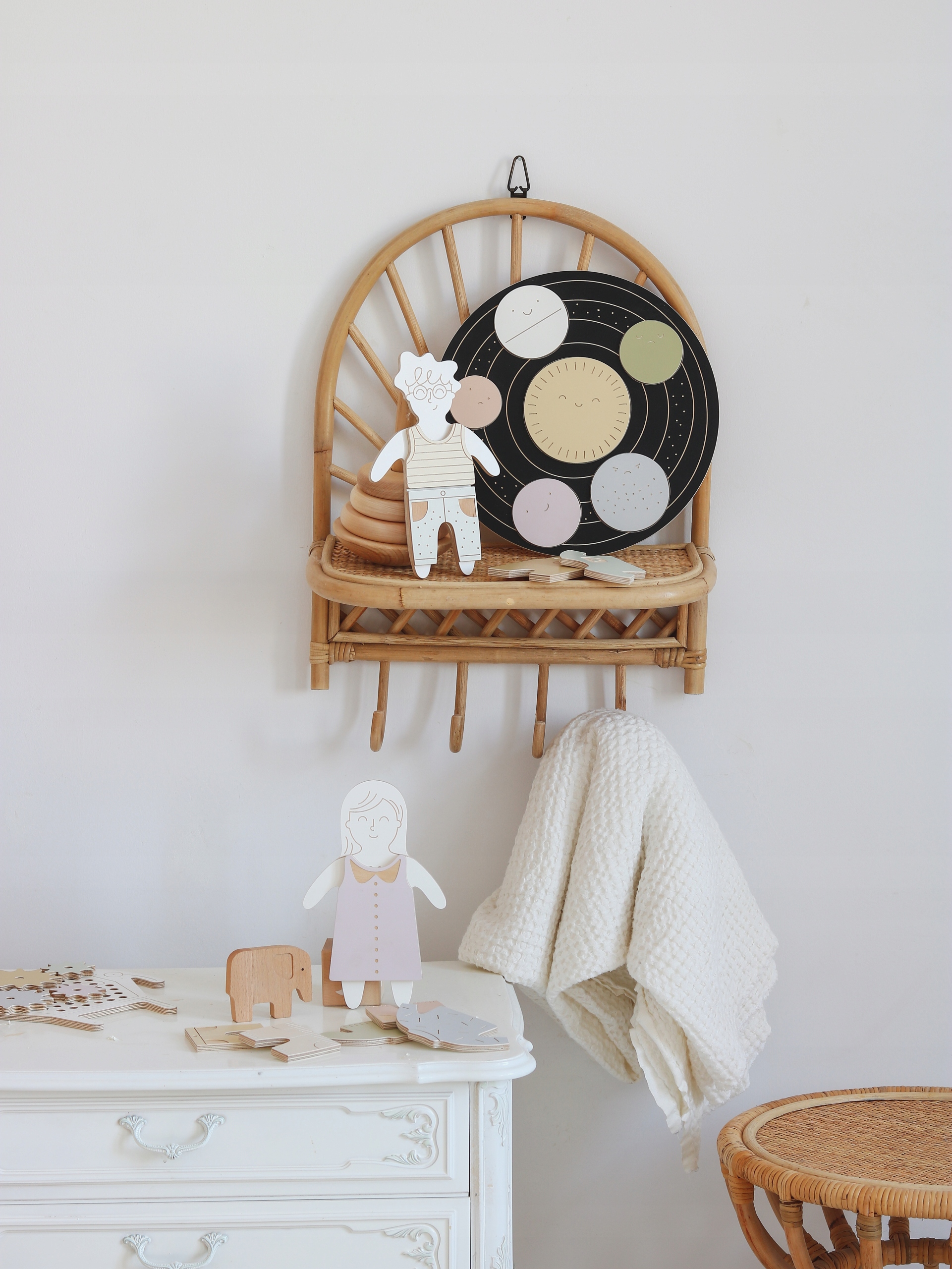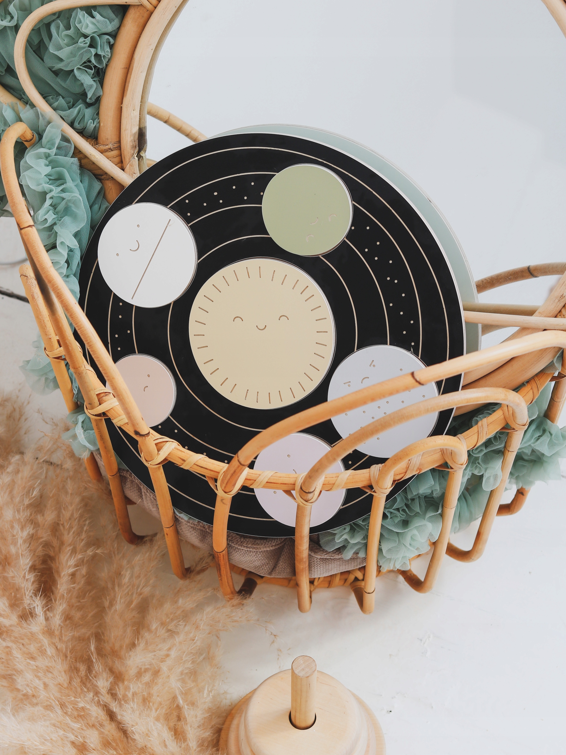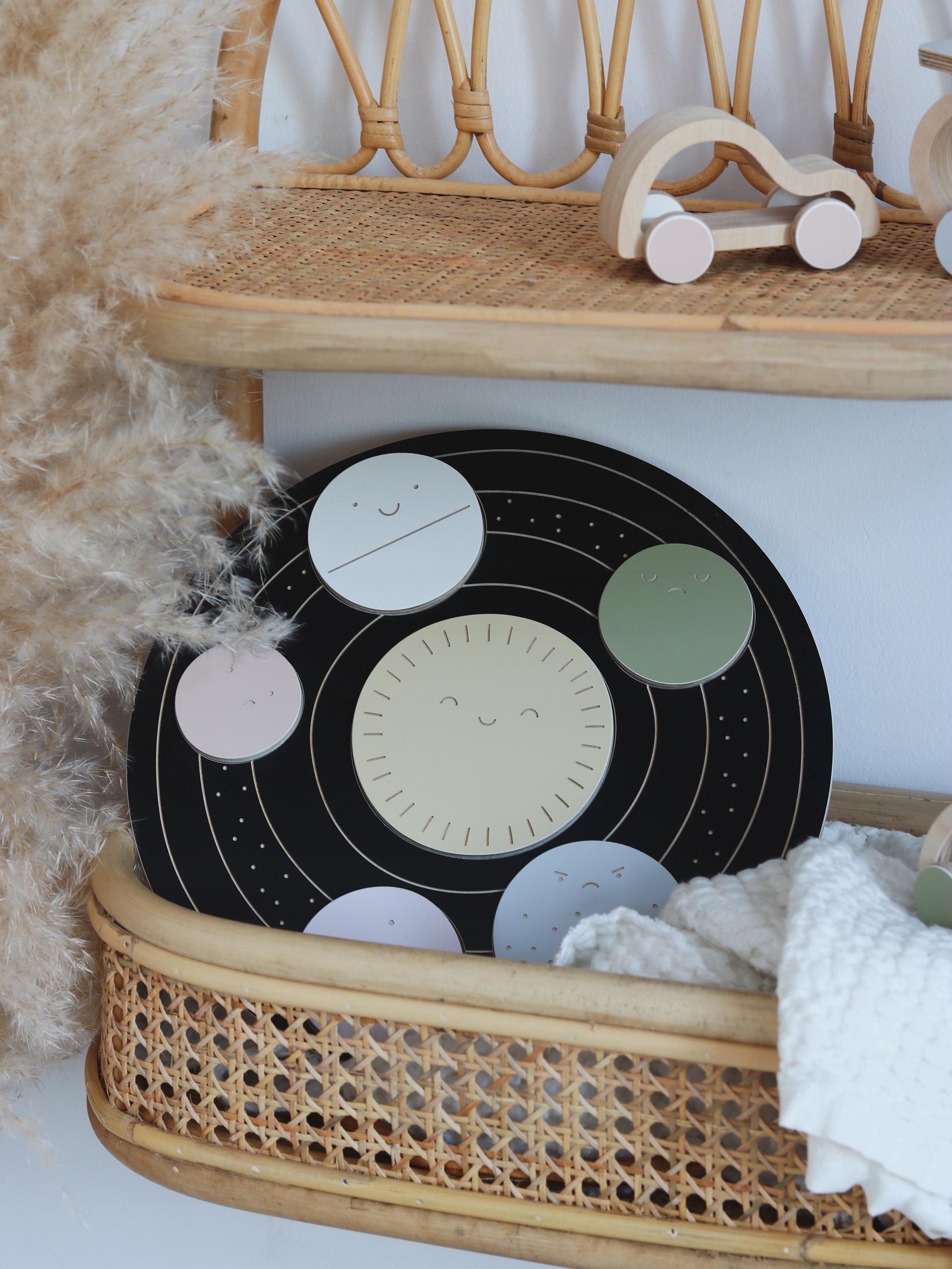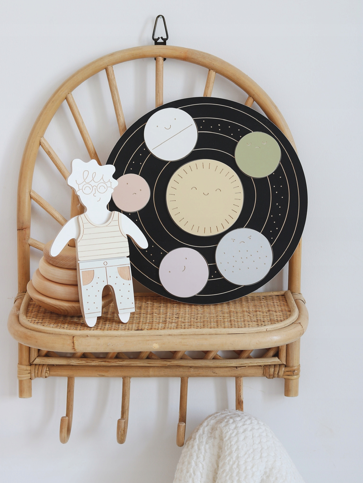 Okrąg posiada wycięte wgłębienia. Zadaniem dziecka jest dopasowanie 6 planet w odpowiednie otworki, to ćwiczenie uczy logicznego myślenia, koordynacji wzrokowo-ruchowej. Dodatkowo każda planeta posiada inny kolor oraz mimikę.
