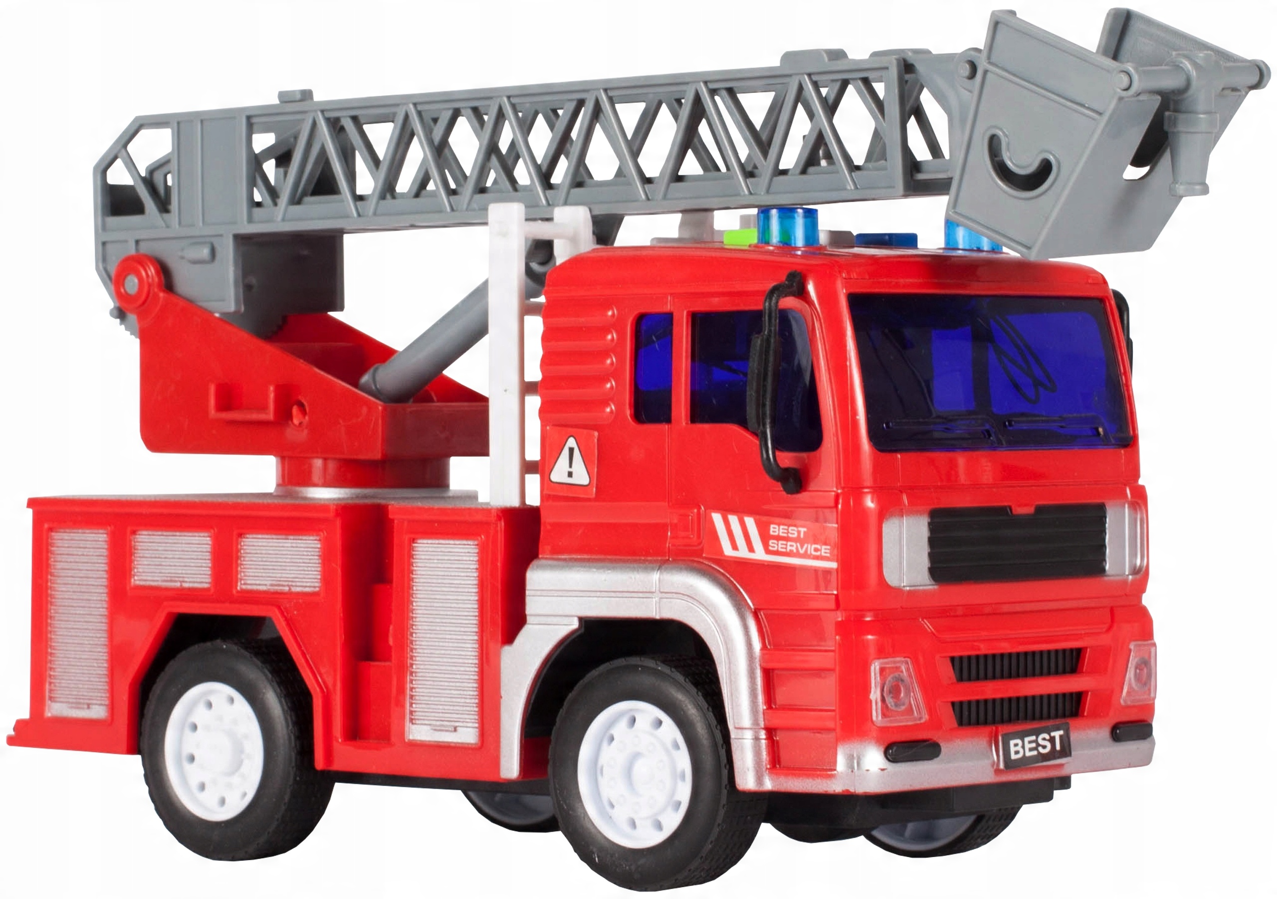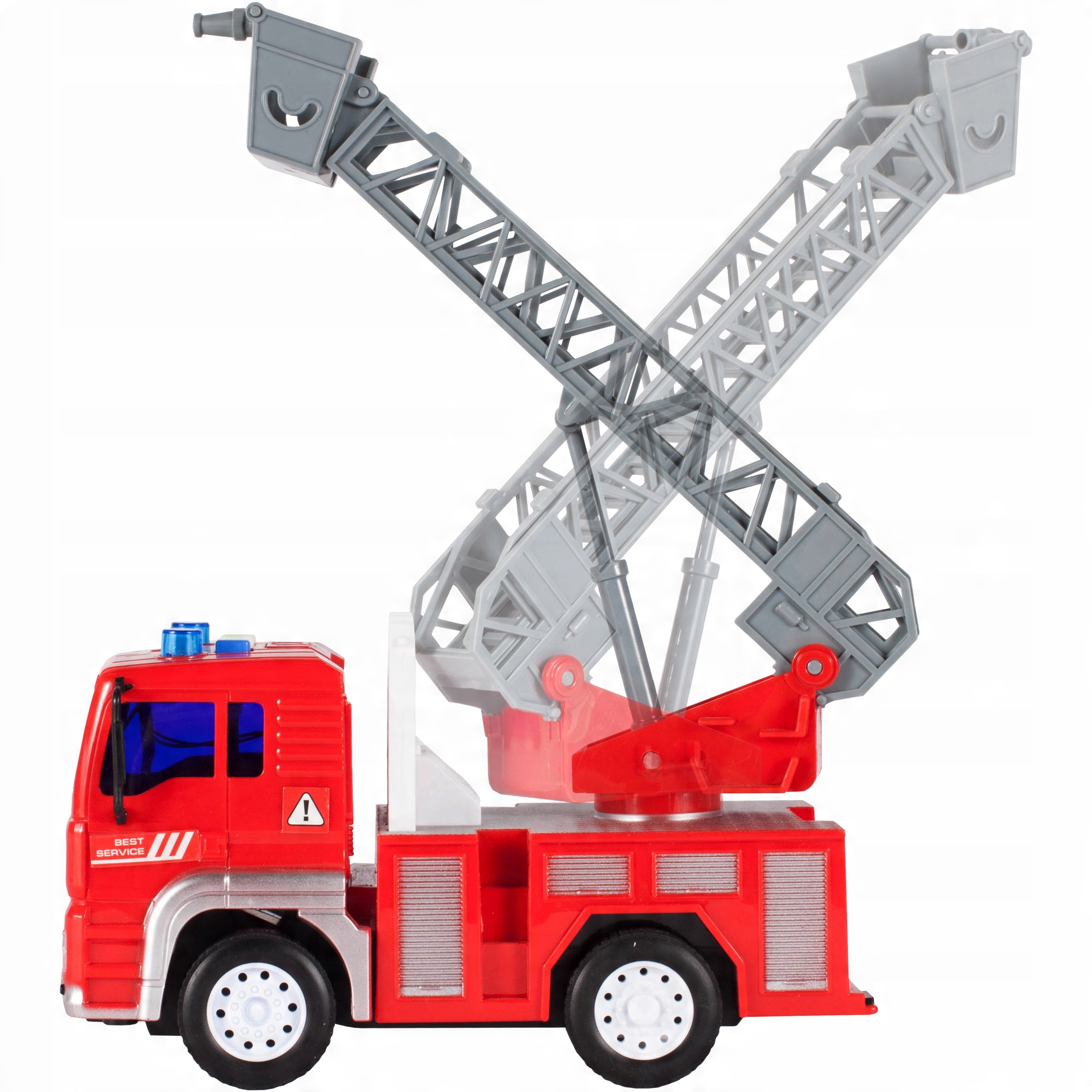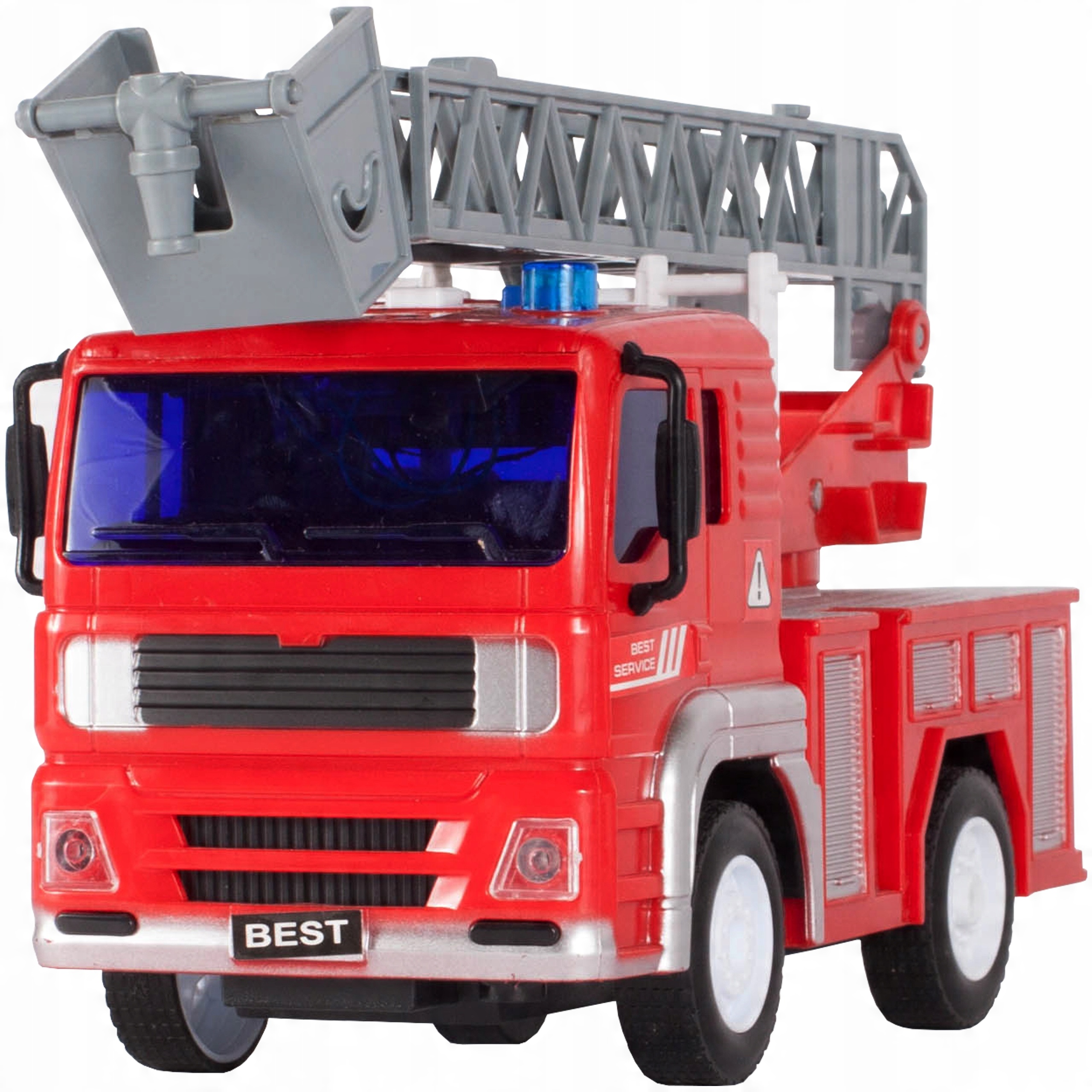 A red fire truck with a folding, rotating ladder with a basket and movable wheels with drive - just put the car on the floor, push it forward and let the car go forward by itself!
