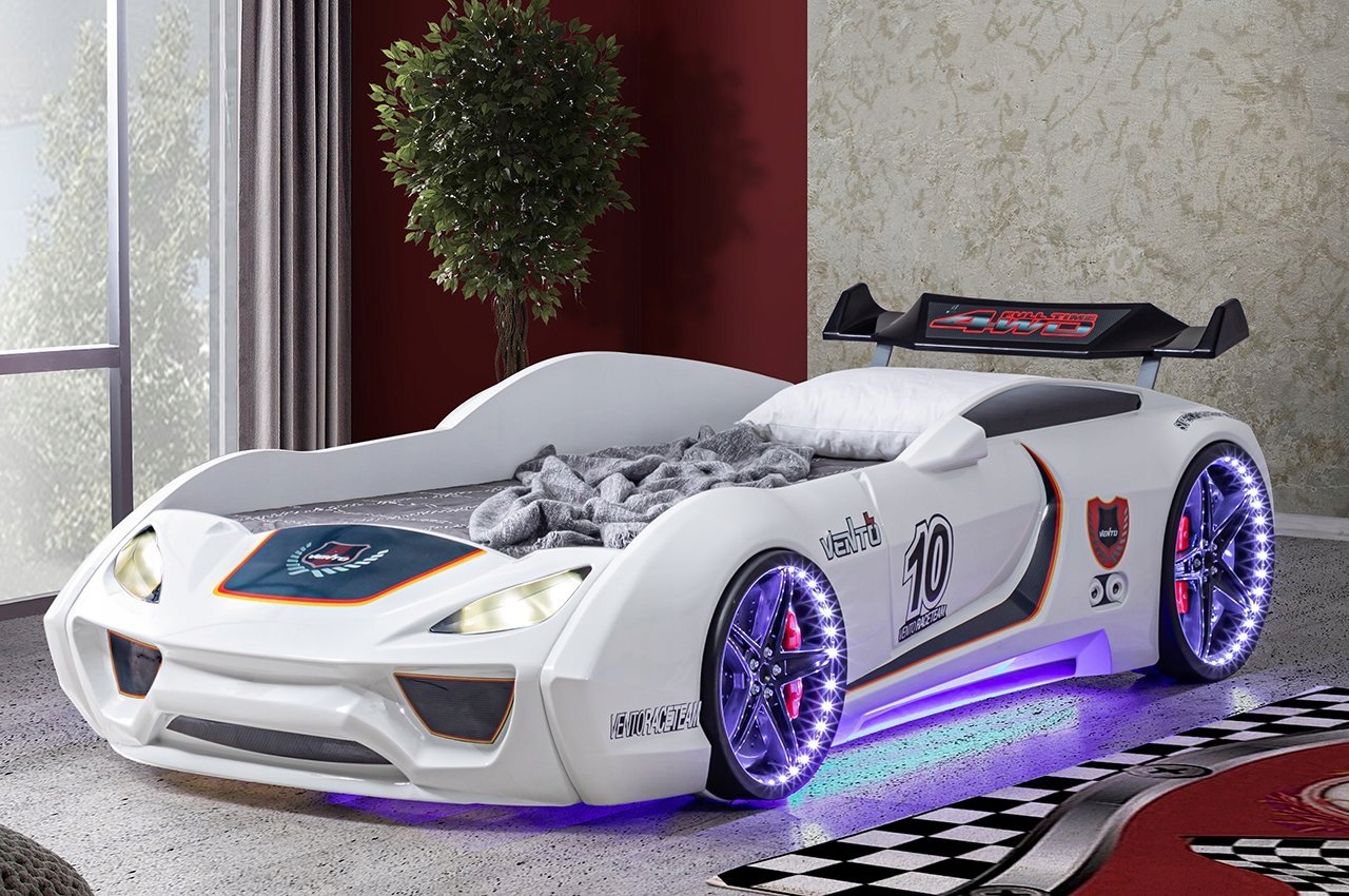 Aukcja dotyczy łóżka w kształcie auta VENTO. Błyszcząca karoseria imitująca lakier samochodowy, oświetlenie LED, dźwięki, pilot oraz sportowa sylwetka.